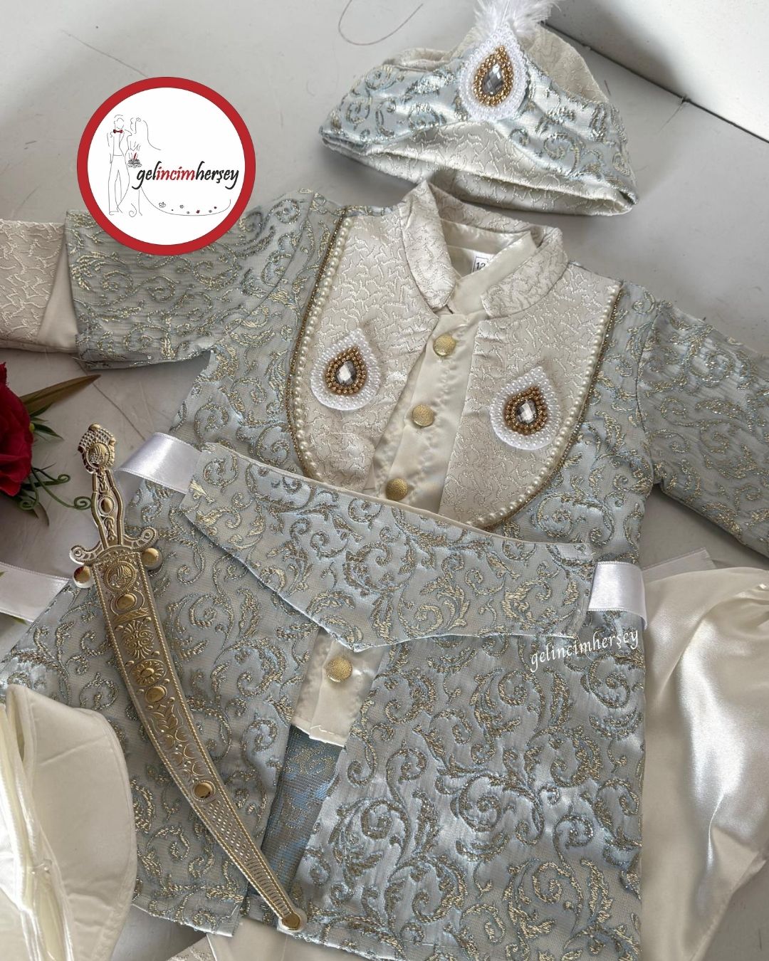 Şehzade konseptiyle hazırlanan bu özel takım, fotoğraf çekimlerinde etkileyici bir görünüm oluşturur ve unutulmaz anılar biriktirmenize yardımcı olur. Geleneksel Osmanlı detaylarıyla tasarlanan 1 yaş erkek bebek sünnet takımı, özel günleriniz için şık ve anlamlı bir seçimdir.
