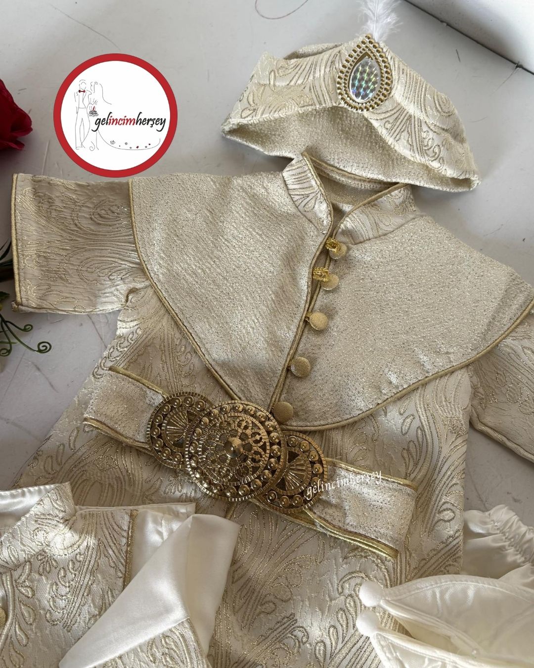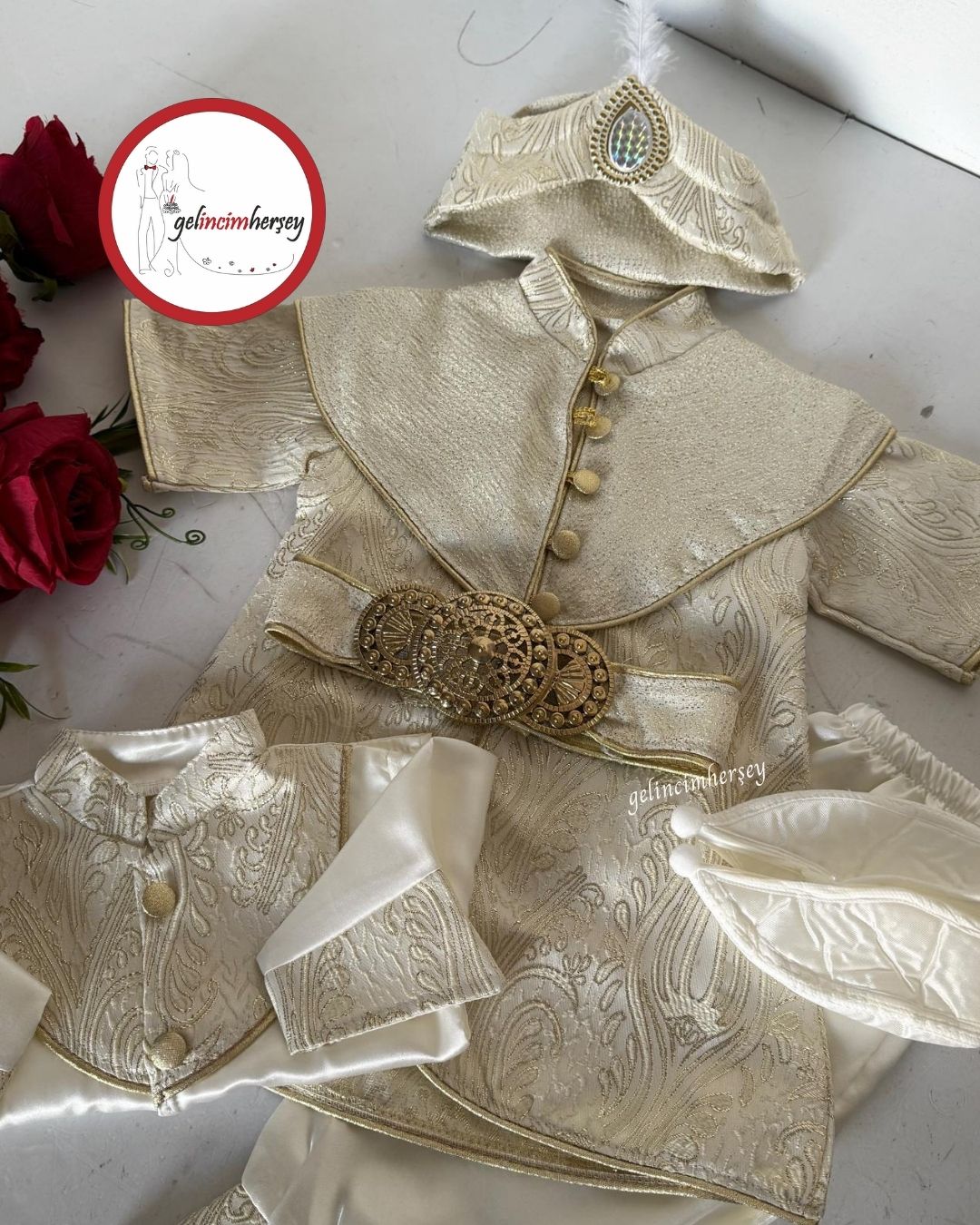 Bebeğinizin en özel günlerini taçlandırmak için hazırlanan Gelincimherşey 1 yaş erkek bebek sünnet takımı, Osmanlı şehzade konseptinden ilham alan detaylarıyla göz kamaştırır.