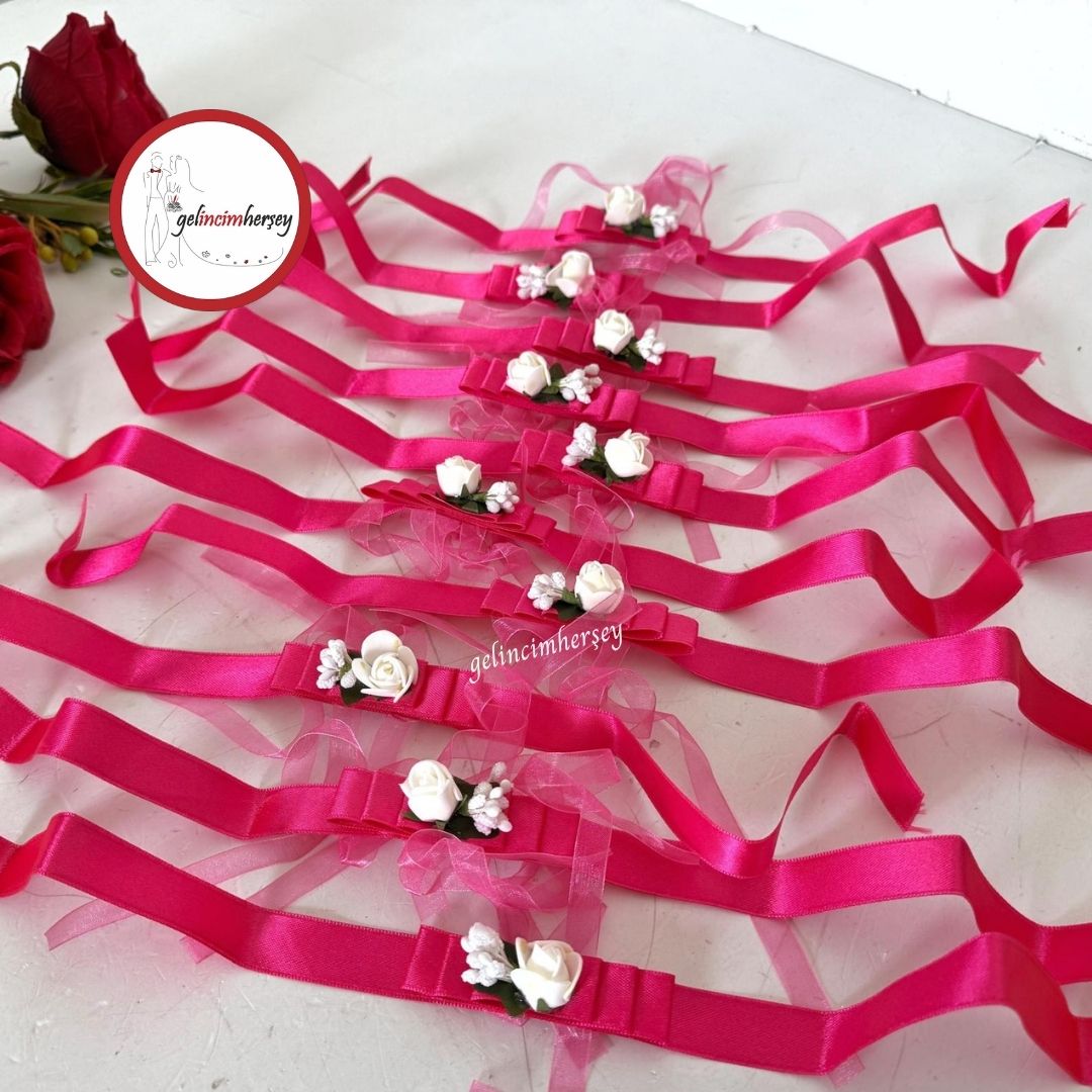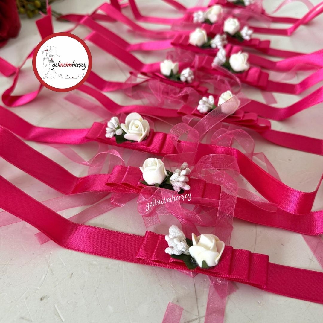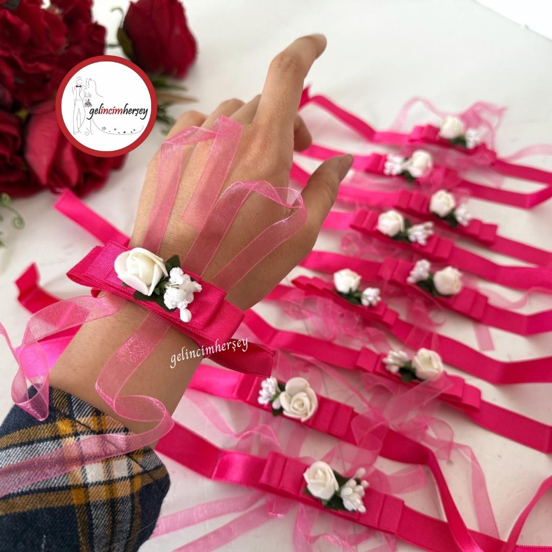 Düğün, kına ve bekârlığa veda organizasyonlarınızda nedimelerinizin şıklığını tamamlayacak zarif bir detay! Kurdeleli tasarımı ve çiçekli pıtırcık süslemeleriyle bu bileklikler, özel günlerinizde uyumlu ve estetik bir görünüm sağlar.