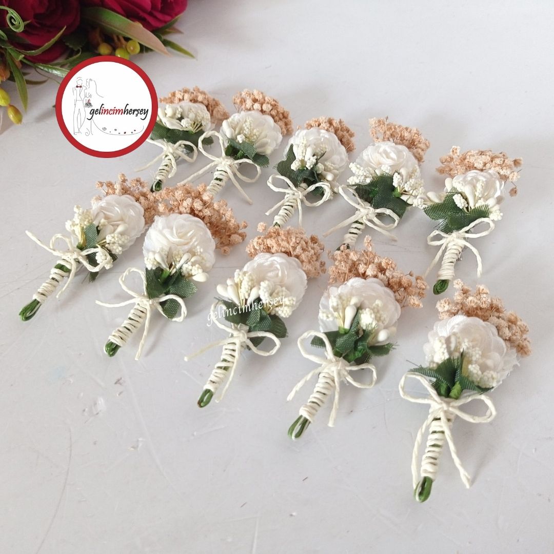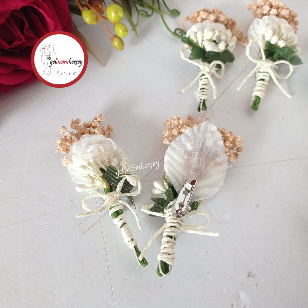 El işçiliğiyle hazırlanmış bu şık yaka çiçekleri, düğünlerde damat ve arkadaşları için zarif bir tamamlayıcı aksesuar sunar. Şoklanmış cipso çiçekleri ve saten güllerin birleşimiyle dikkat çeken ürün, her detayıyla göz alıcı bir görünüm sunar.