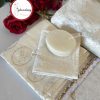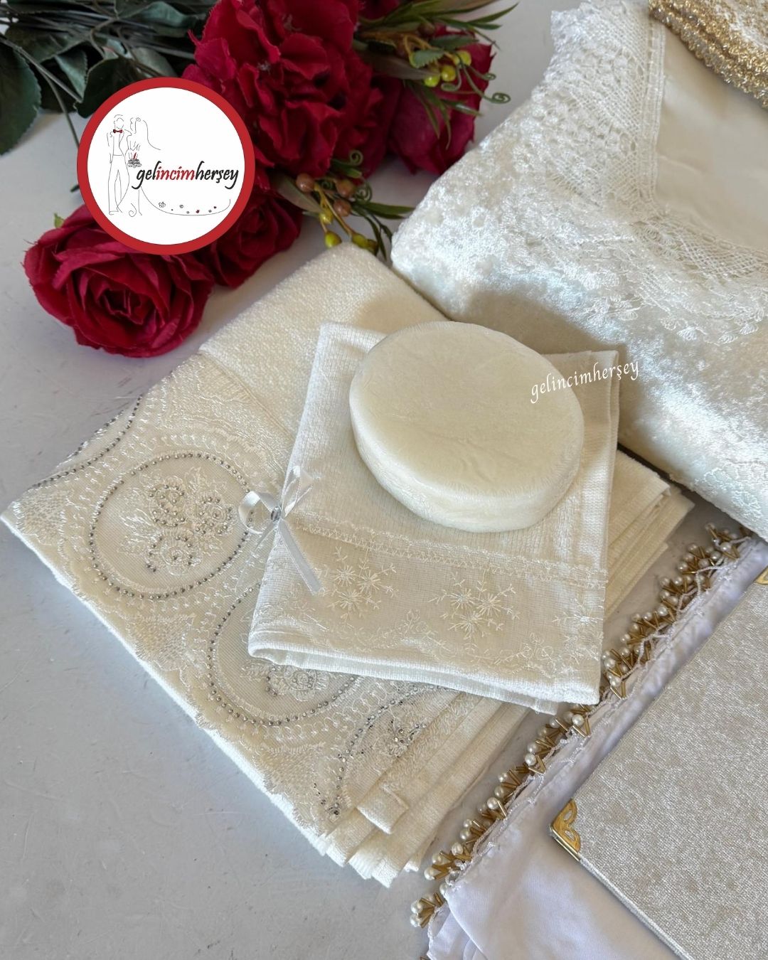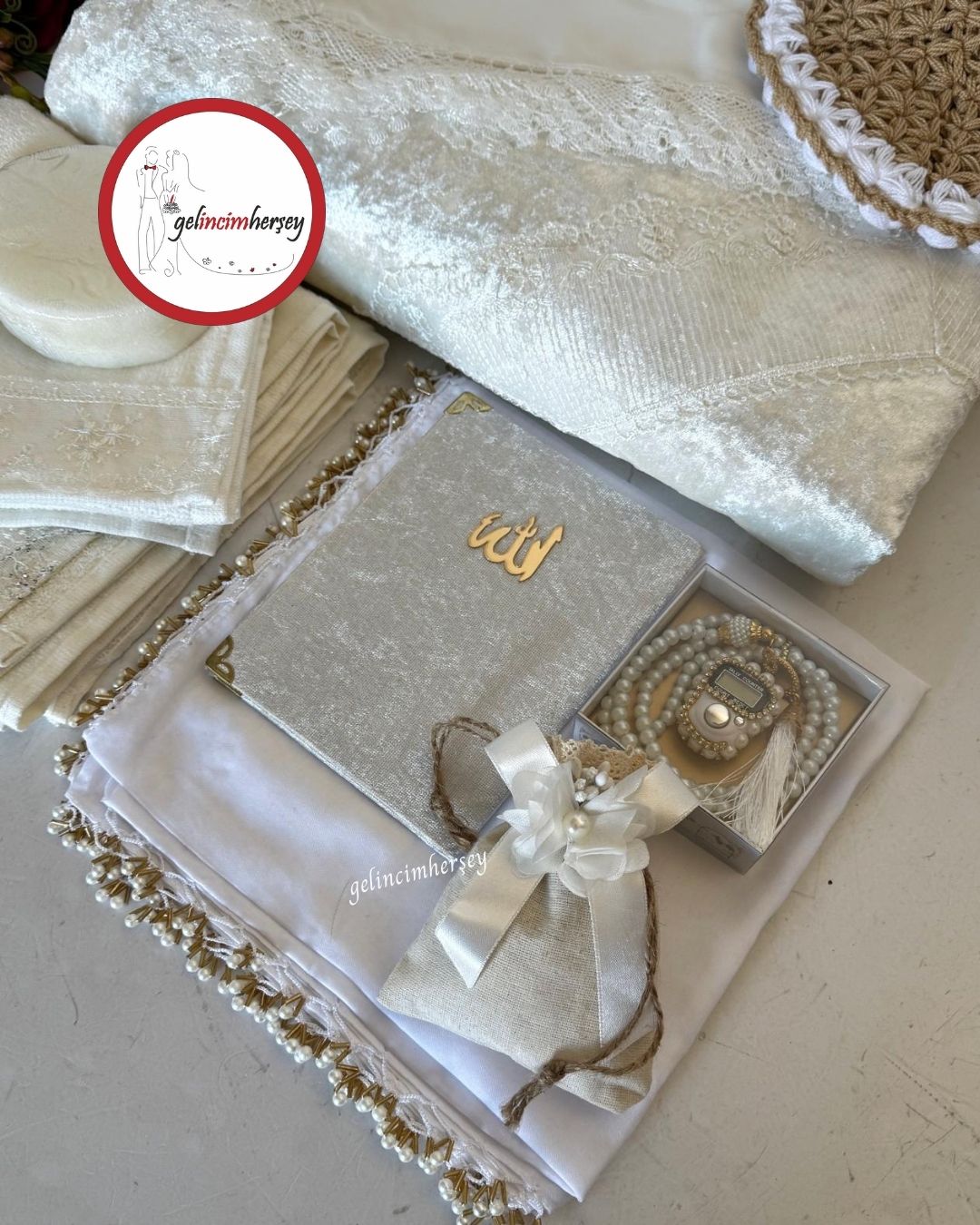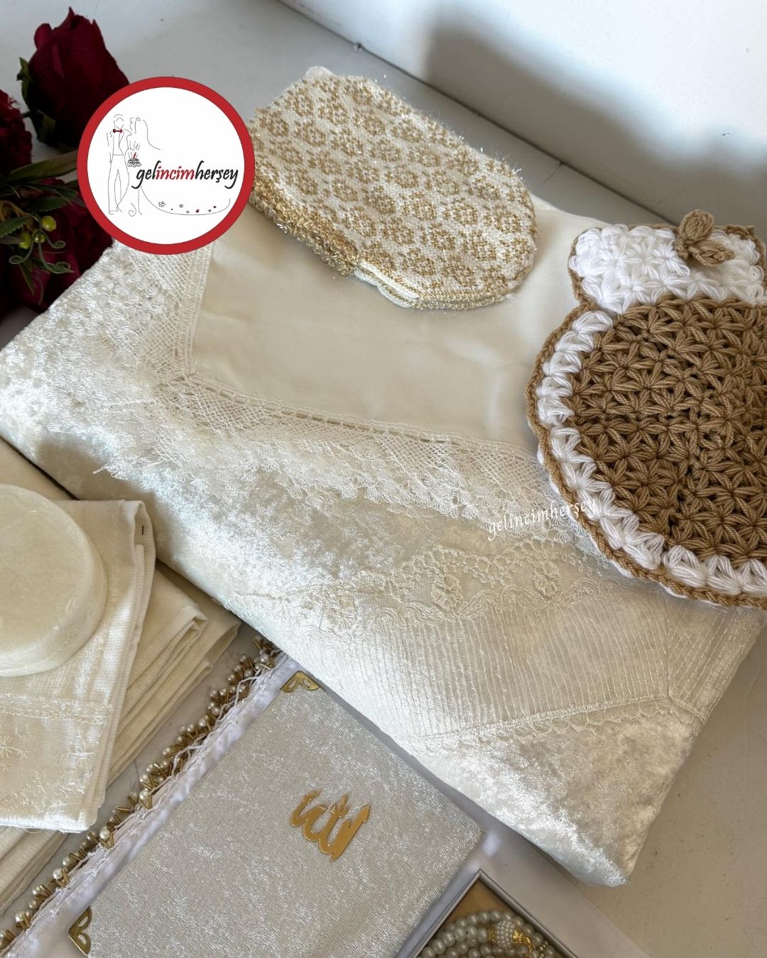 Ayrıca söz, nişan, çeyiz , bohça götürme ve özel ziyaretlerde tercih edilen bu bohça seti; ekru tonlarının sade şıklığıyla her yaş grubuna hitap eder. Set içerisinde yer alan seccade, şal, tülbent, tesbih ve havlular; bohça geleneğine uygun şekilde bir araya getirilmiştir.