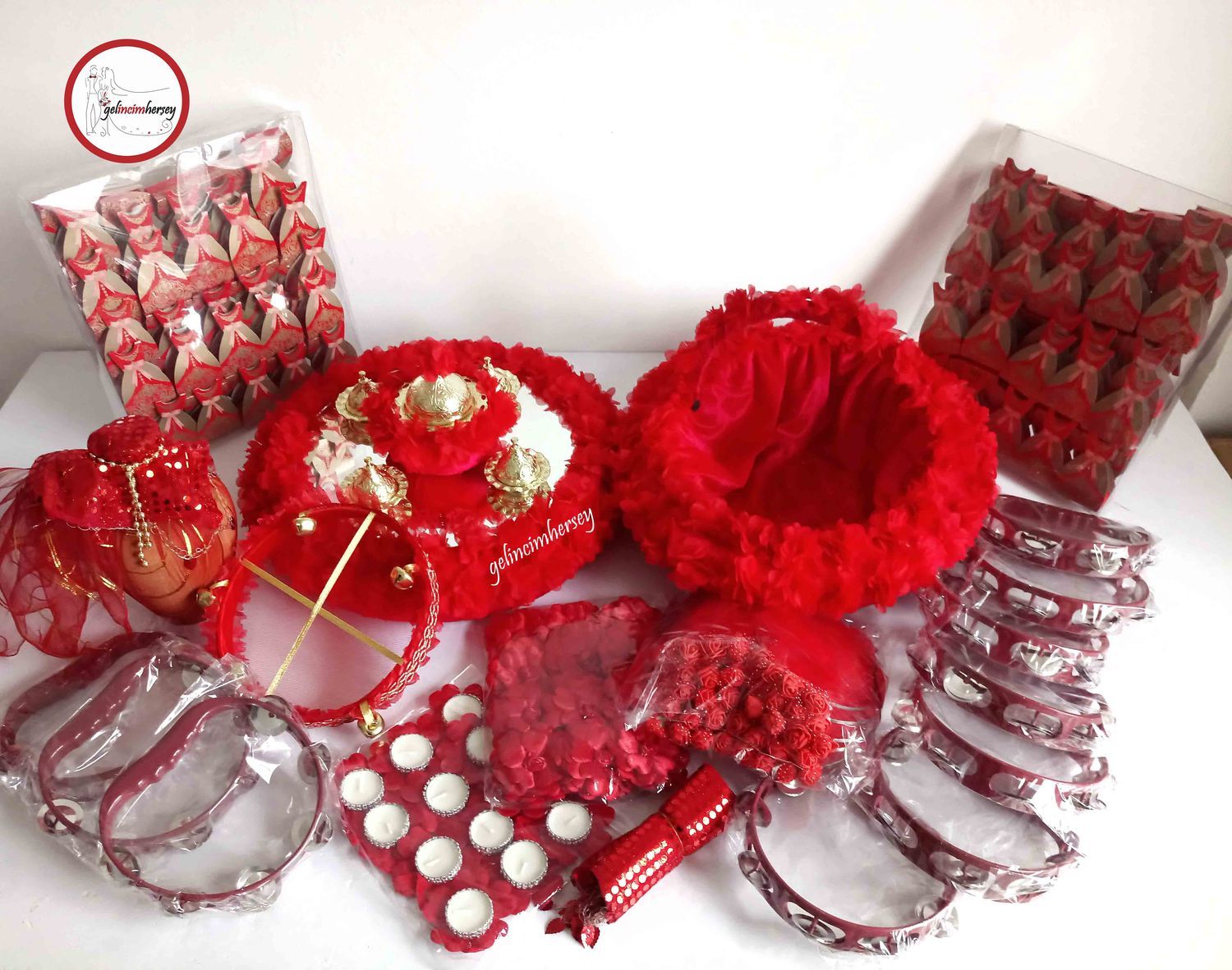 Kırmızının asaletini taşıyan 158 parçalık bu lüks kına seti, gelinlerin en özel gecesini unutulmaz kılmak için özenle hazırlandı. Gösterişli, eksiksiz ve tam aradığınız gibi!