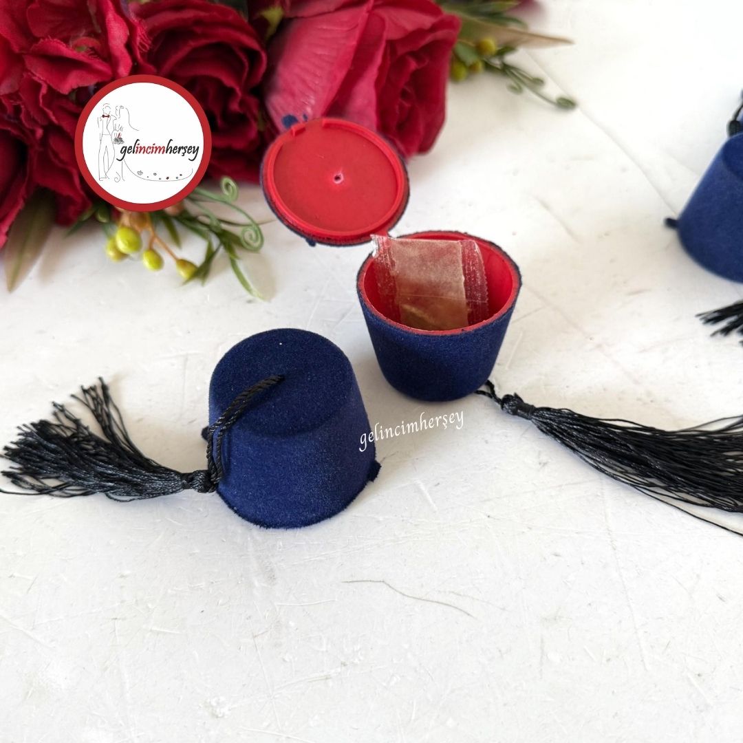 Gelincimherşey’in özel tasarımıyla hazırlanan fes şeklinde püsküllü süet kaplı kına kutuları, hem geleneksel hem şık bir hediye alternatifi sunar. Misafirlerinize dağıtabileceğiniz bu özel kutular, kına gecenizin hatırası olarak kalacak.