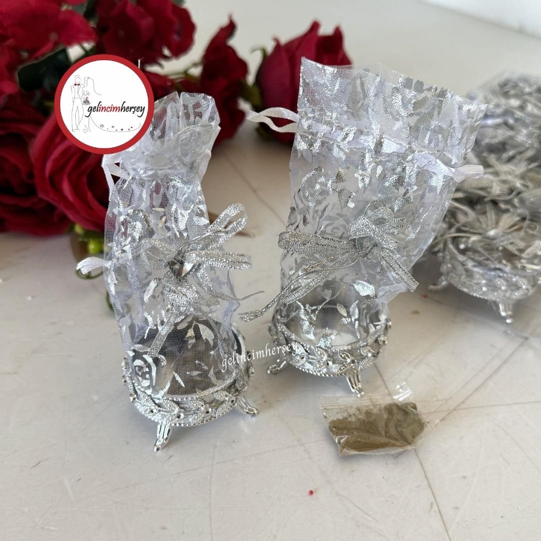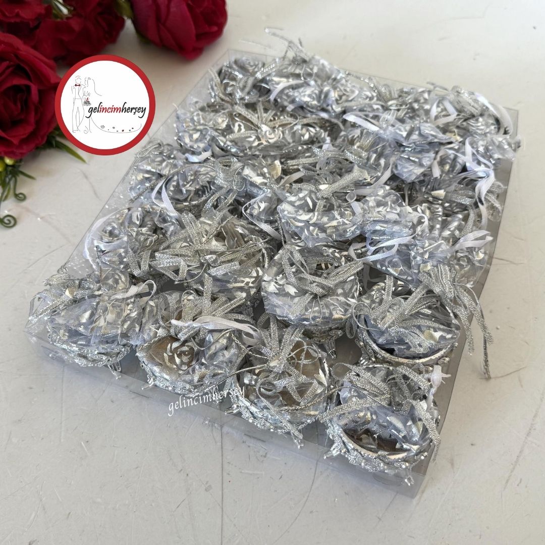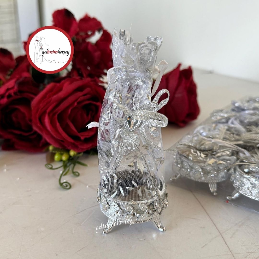 Kına gecelerine zarafet katan, gösterişli sandık tasarımıyla dikkat çeken bu keseli hediyelik kınalar;altın ve gümüş detaylı seçenekleriyle göz kamaştırıyor. Şeffaf tül kesesi ve dekoratif kurdele süslemeleriyle hem nostaljik hem de şık bir hediye alternatifi sunar.