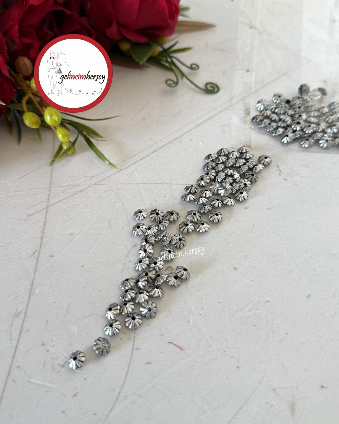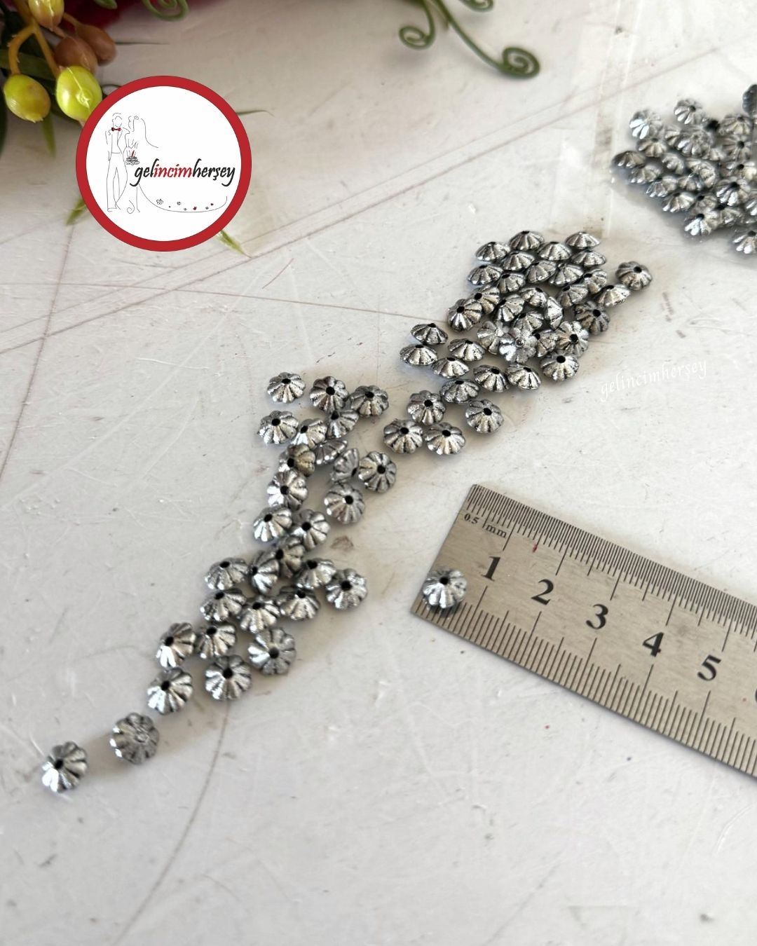 Takı ve el işi çalışmalarında boncuklar arasında şık bir geçiş sağlayan 8 mm gümüş renk plastik ara tabak boncuk, 25’li paket halinde sunulur.