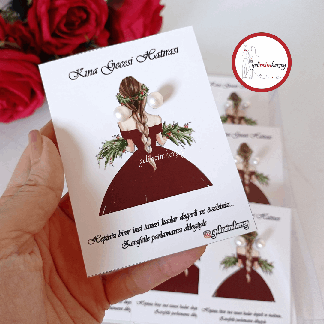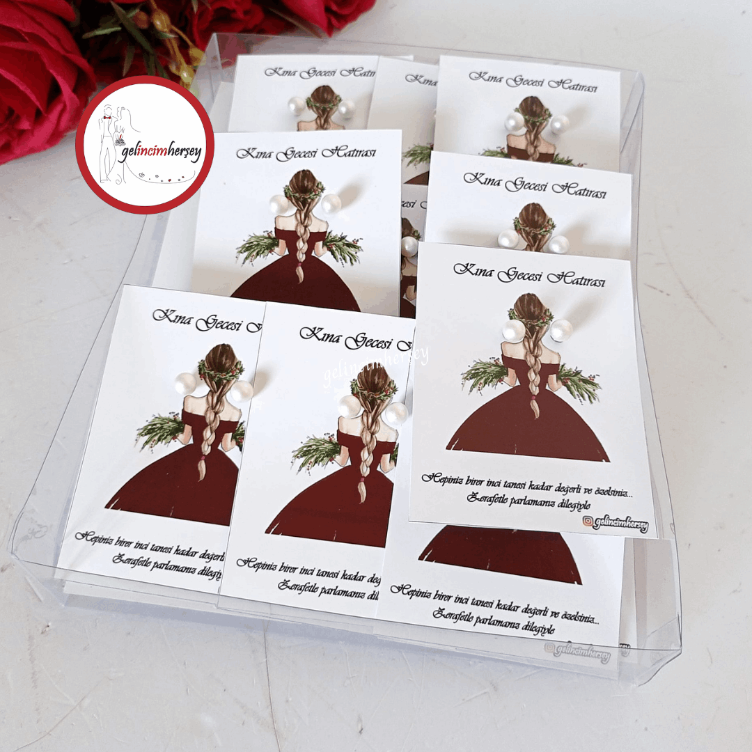 Zarif inci detaylı küpeler, özel davetlerde şıklığı simgelerken kına gecenize anlam ve estetik katıyor. Misafirlerinize kalıcı bir hatıra sunmak için ideal.