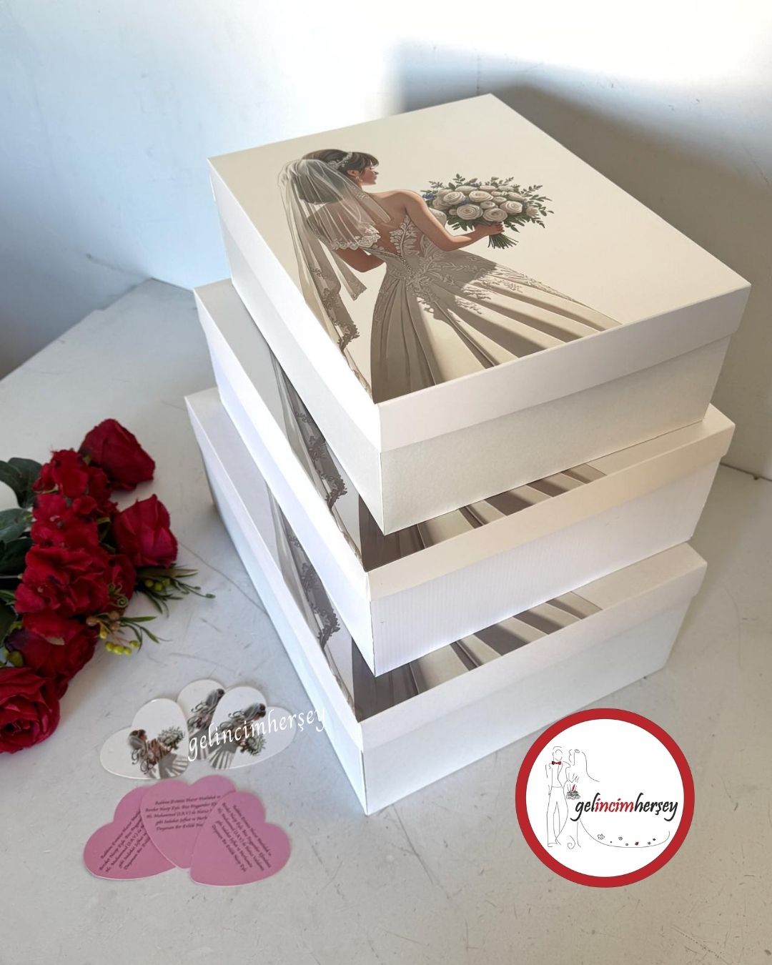 3 farklı boydan oluşan gelin resimli çeyiz bohça kutusu seti. Kaliteli mukavva kartondan üretilmiştir. Görseldeki etiketlerle birlikte gönderilir.