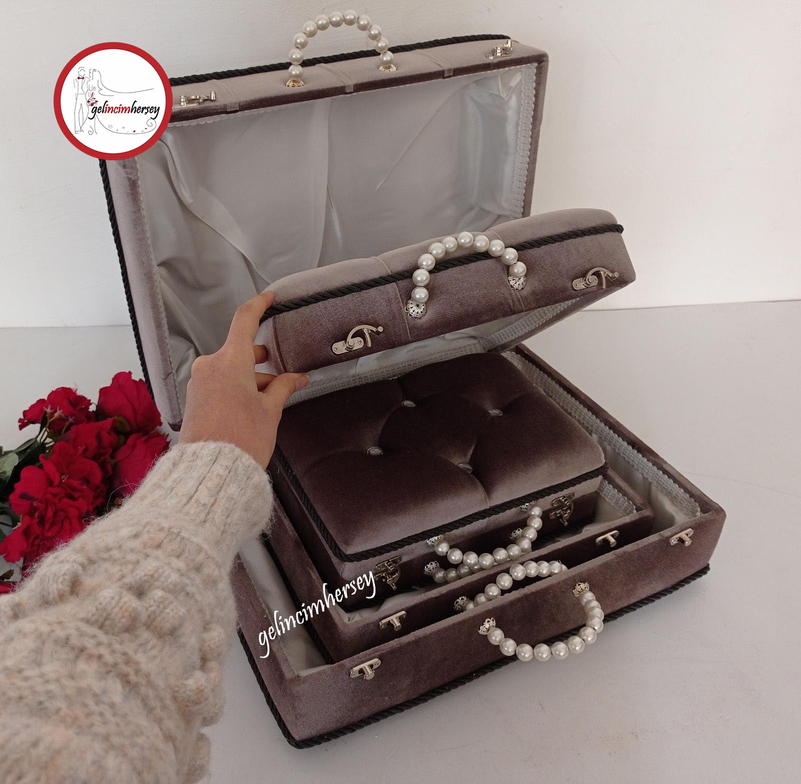 Gelincimherşey 3’lü İnci Saplı Kadife Gelin Sandığı – Valiz Model