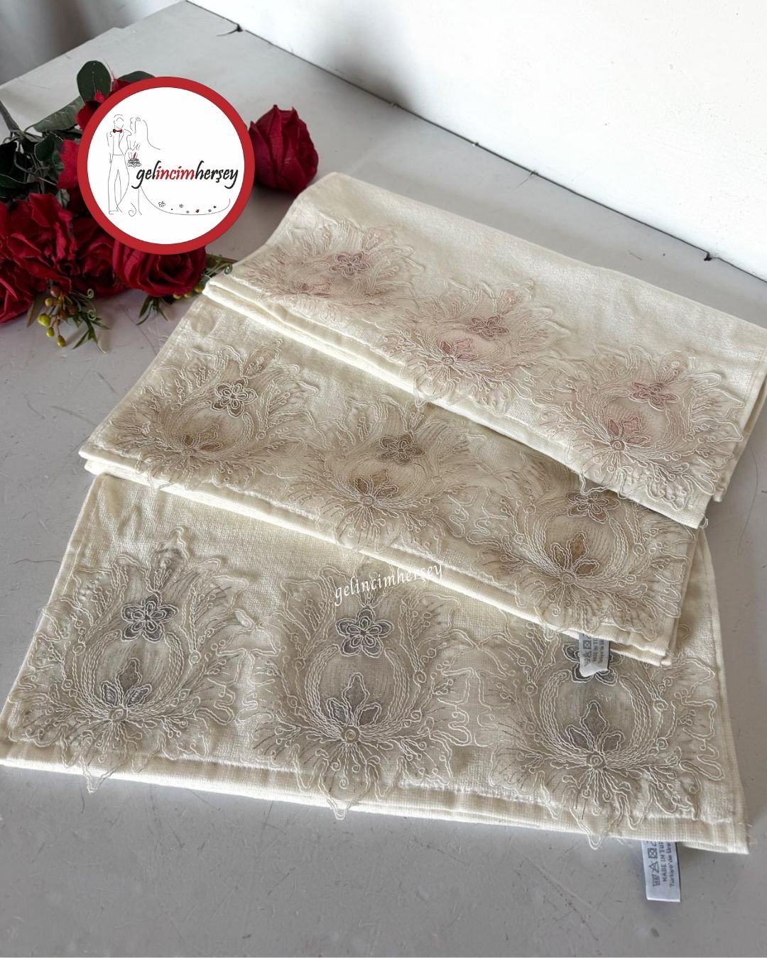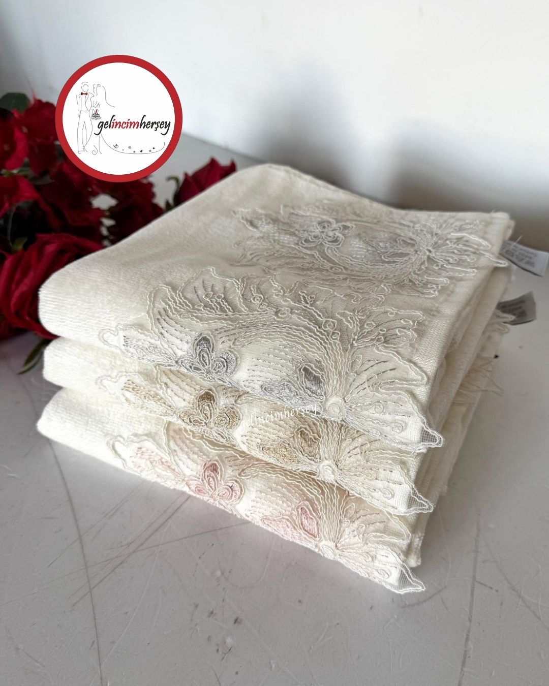 Gelincimherşey 3’lü Krem Geniş Lüks Nakışlı Fransız Güpürlü Kadife Dokulu El & Yüz Havlu Seti
