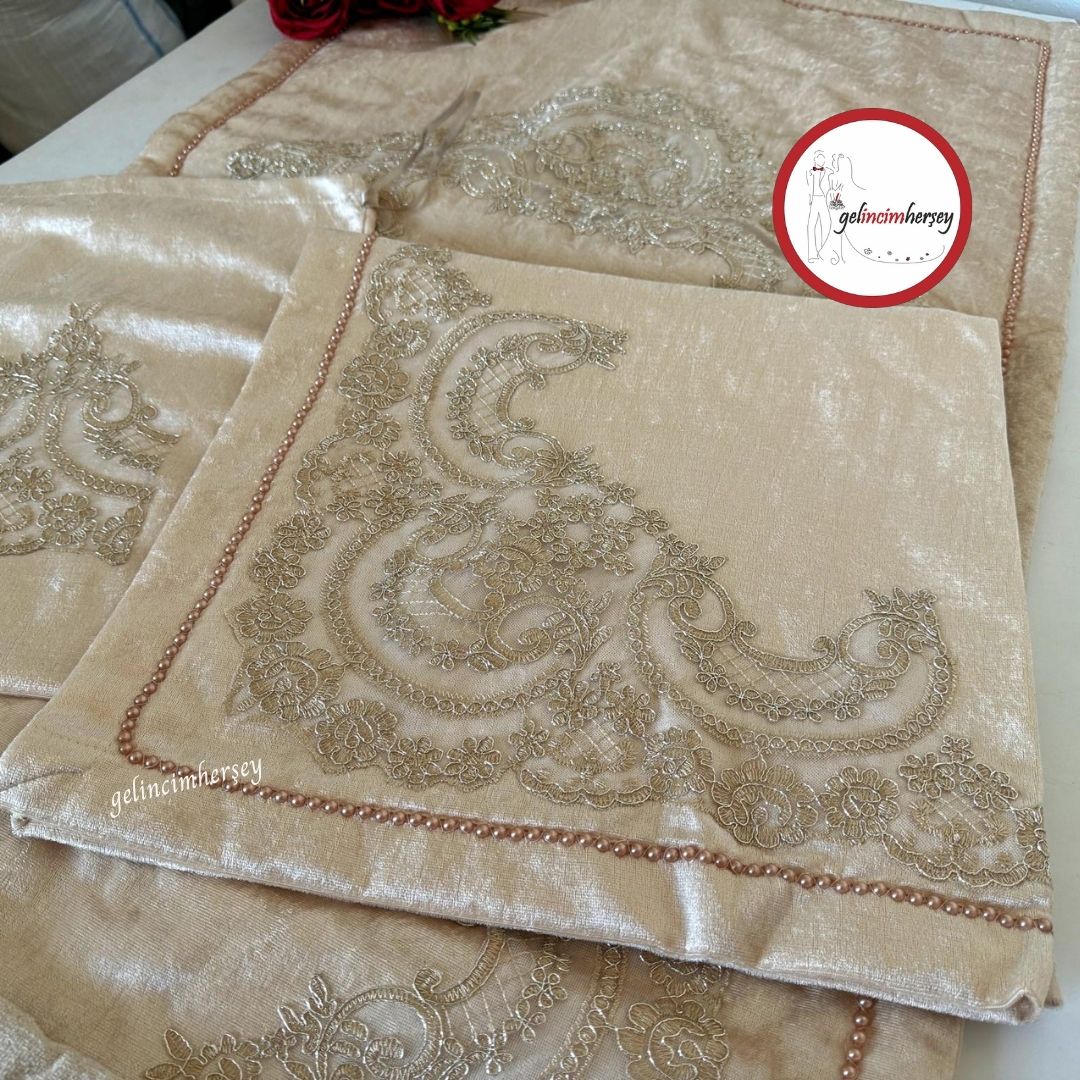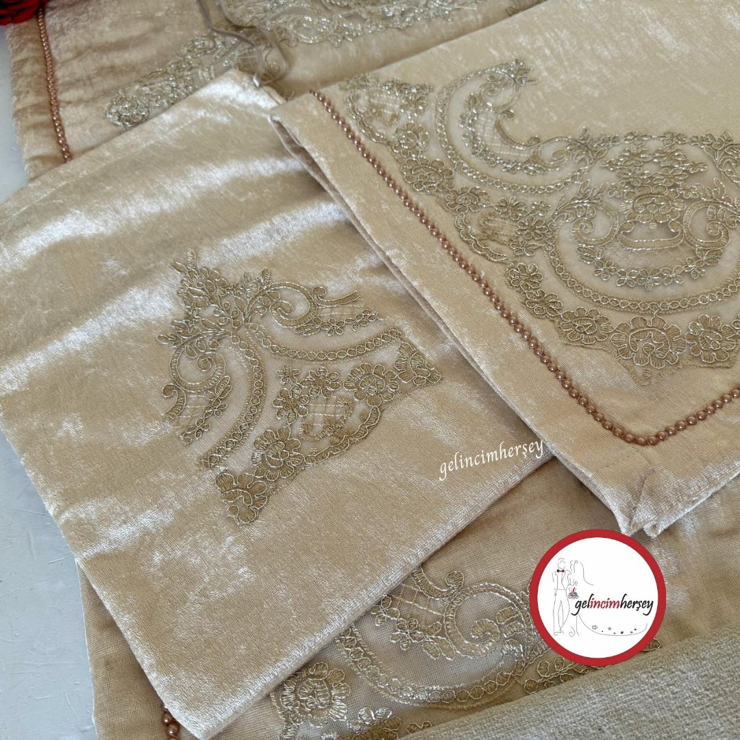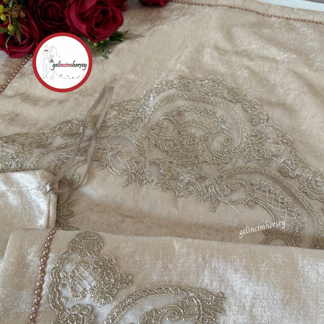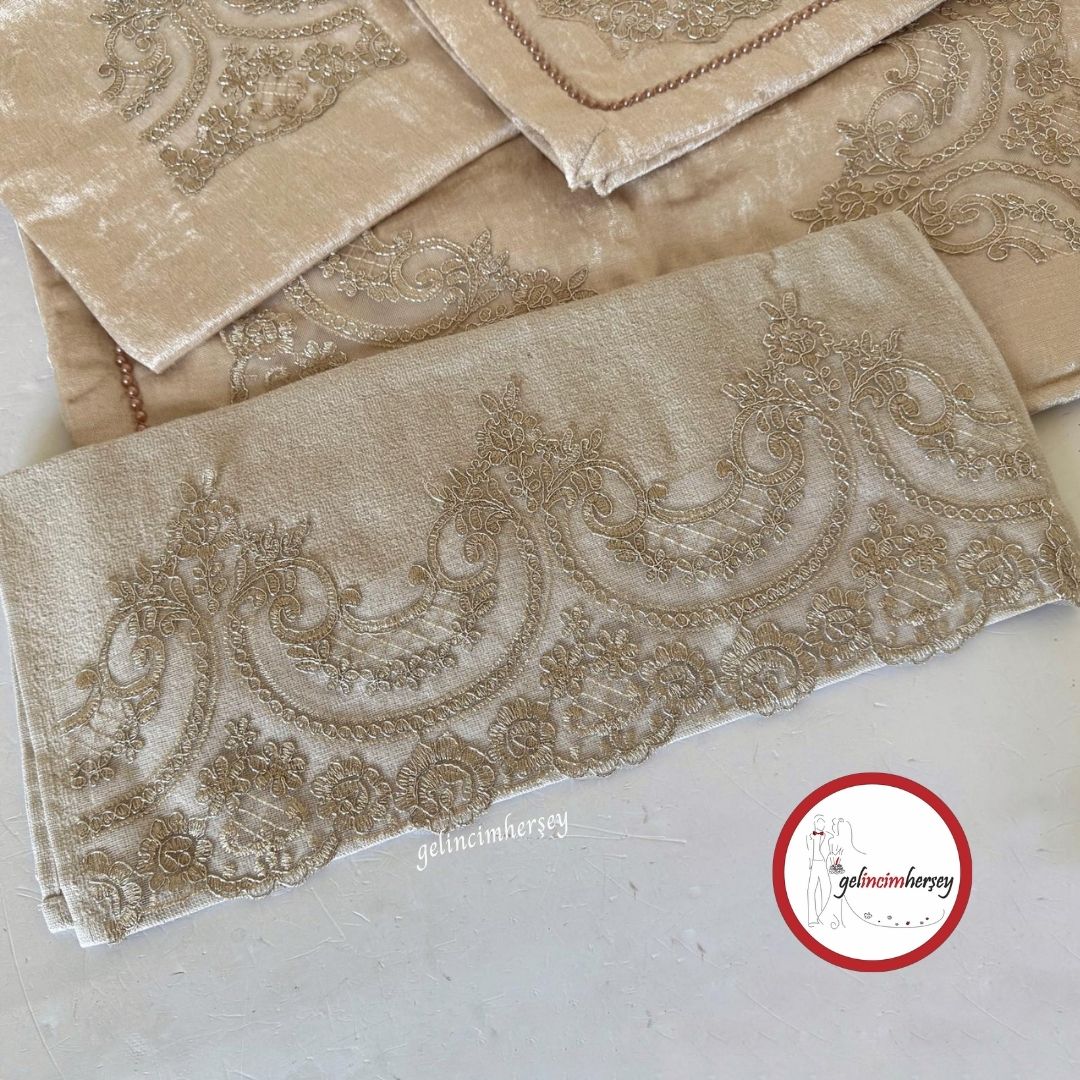 Gelincimherşey 4 Parça Fransız Güpürlü Bej Kadife Seccade Seti