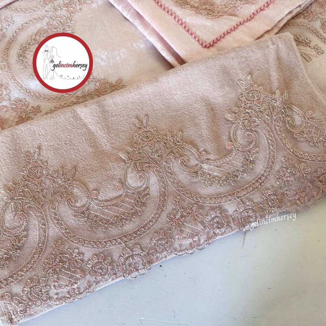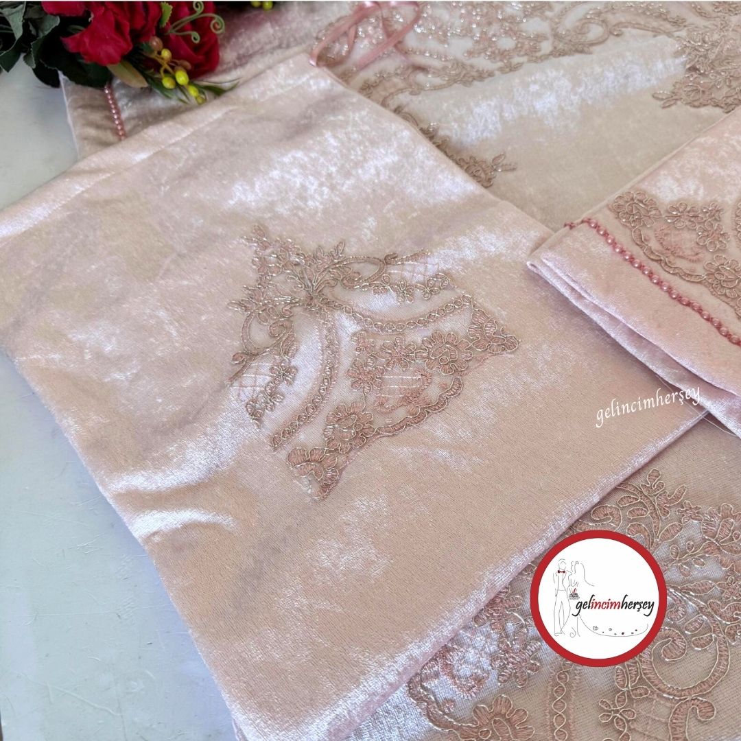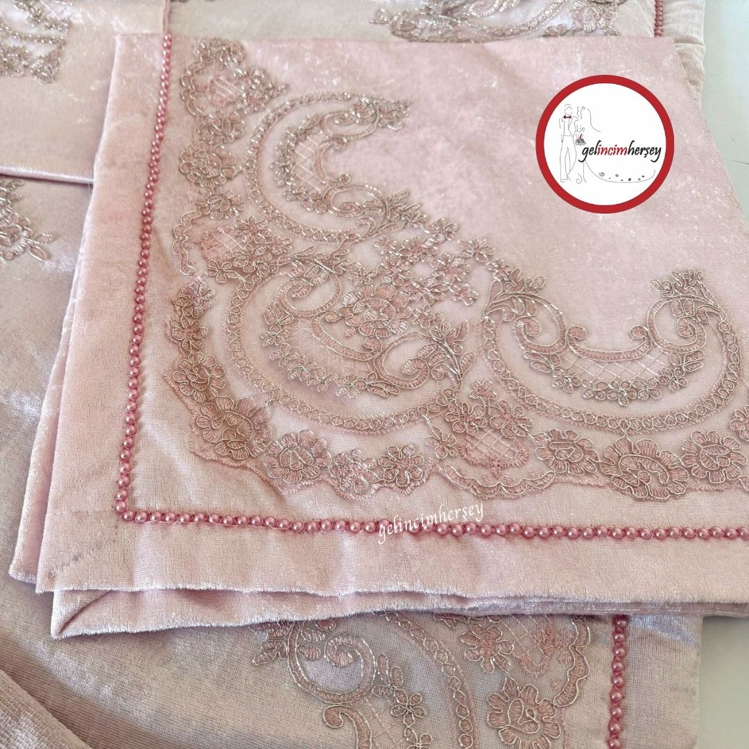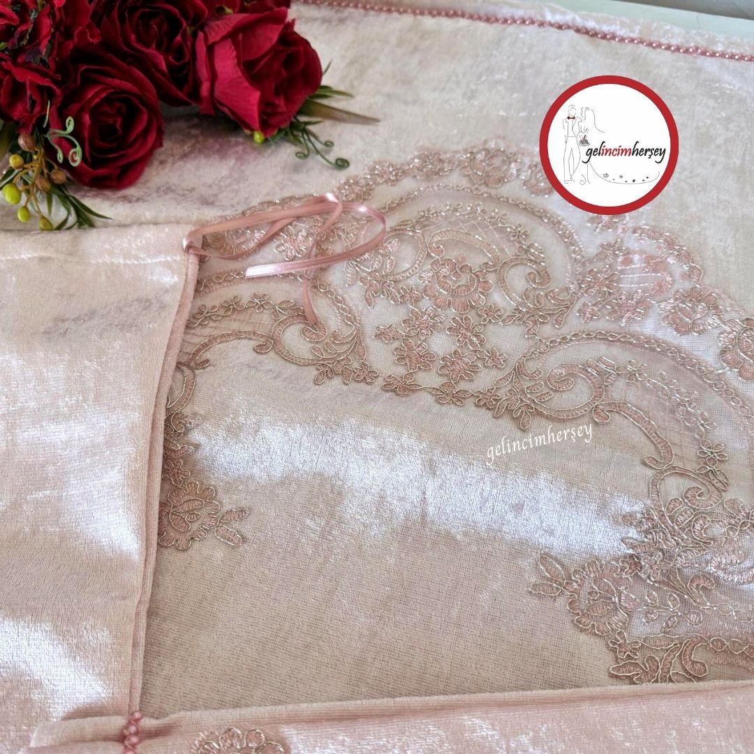 Gelincimherşey 4 Parça Fransız Güpürlü Pudra Kadife Seccade Seti – Gelin ,Damat Bohça Takımı