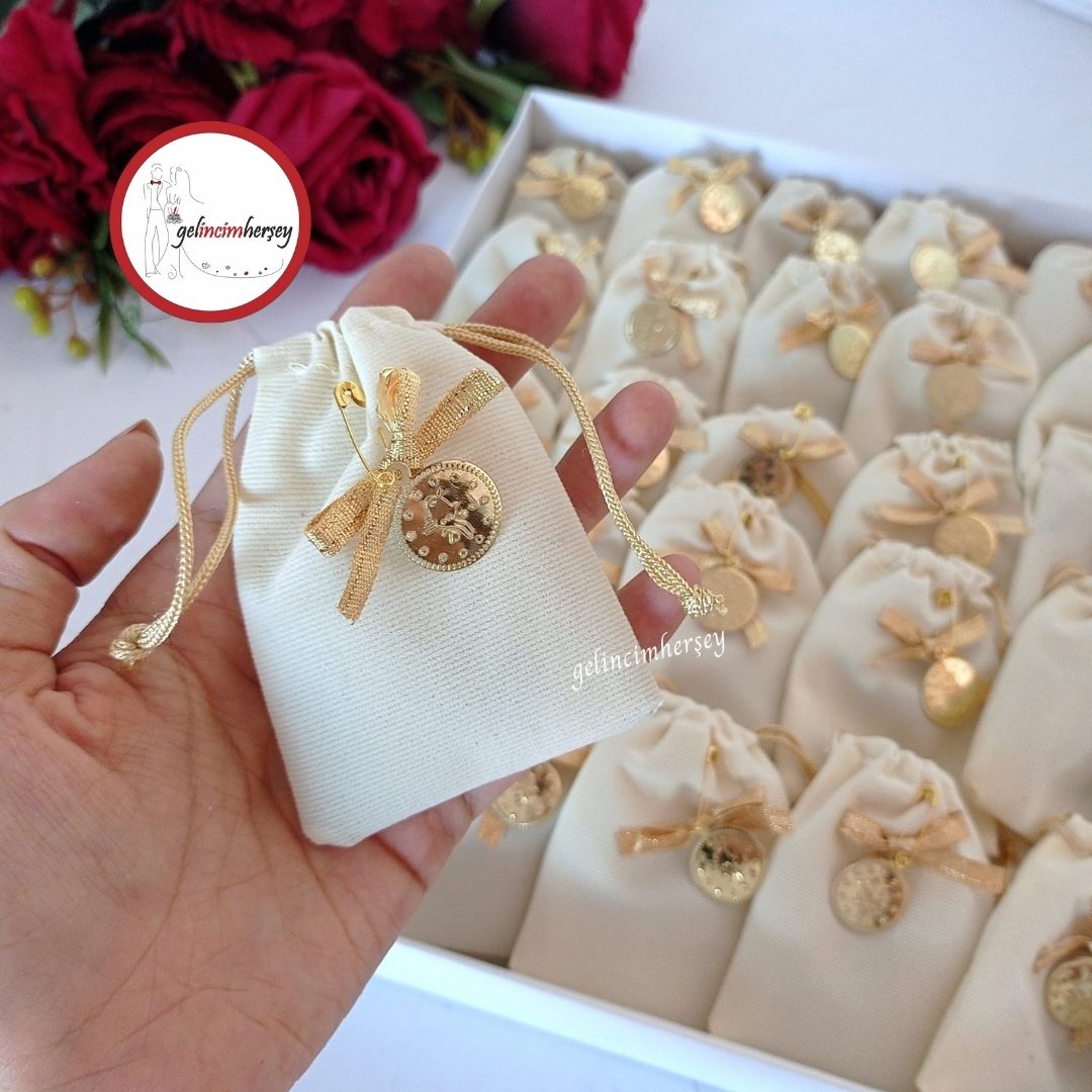 Kına gecenizi unutulmaz kılacak zarif ve kullanışlı bir seçenek! Payet işlemeleri ve çeyrek altın görünümlü süslemeleriyle öne çıkan bu süet keseler, içlerindeki ambalajlı toz kına ile birlikte hazır şekilde gönderilmektedir. Elinize ulaştığında direkt olarak davetlilere sunabileceğiniz bu hediyelikler, hem geleneksel hem de şık bir sunum arayanlar için idealdir.