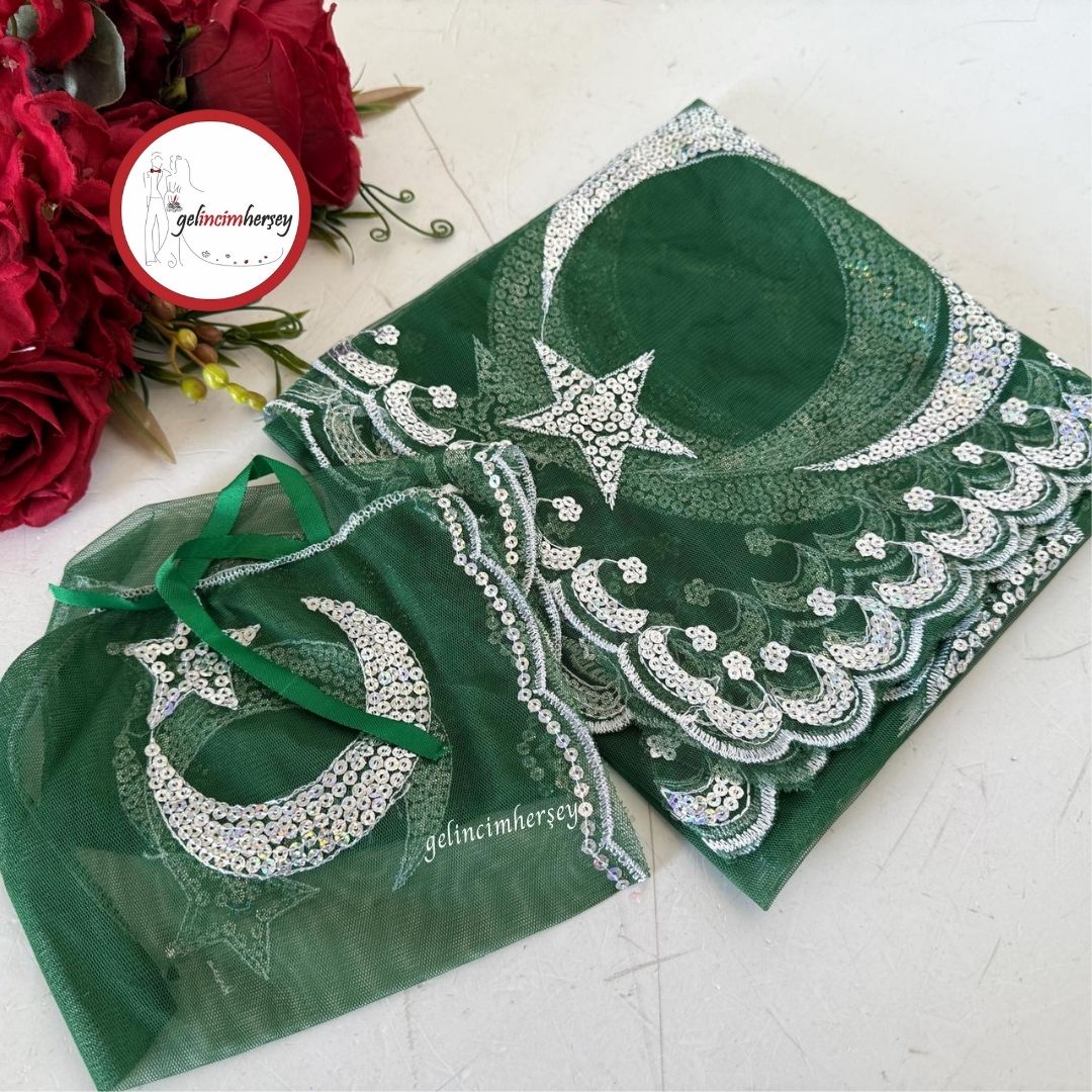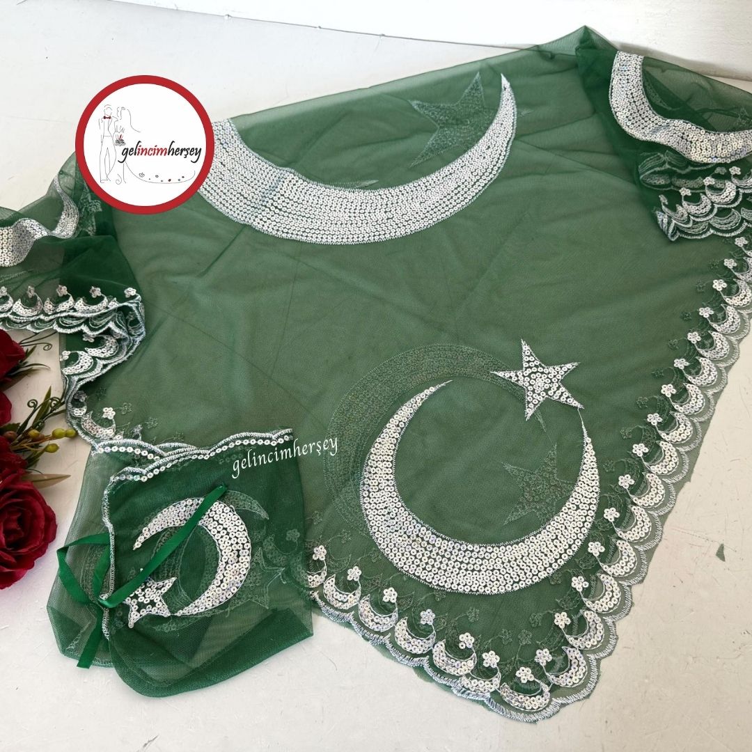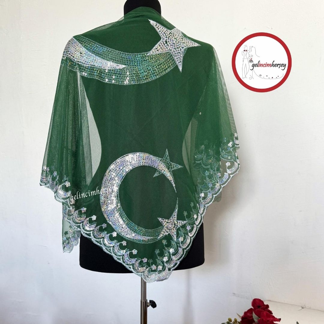 Gelincimherşey Ay Yıldız Pullu Yeşil Omuz Örtüsü Damat Duvağı