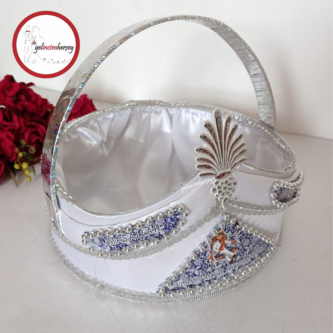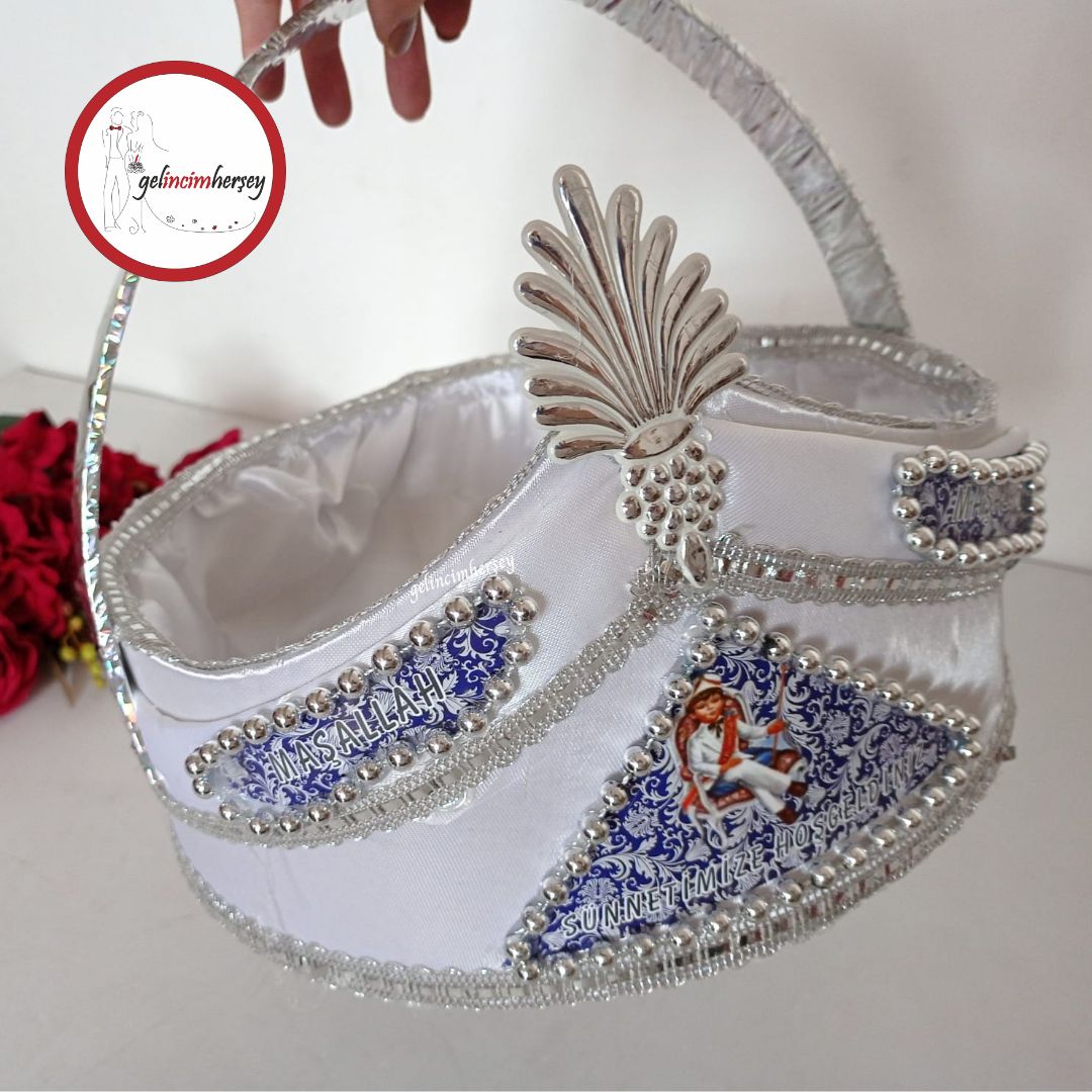 Beyaz saten kaplaması ve zarif boncuk süslemeleriyle sünnet temalı şapka sepet, hediyelik sunumlarınızda dikkat çeken, şık ve kullanışlı bir alternatif sunar.