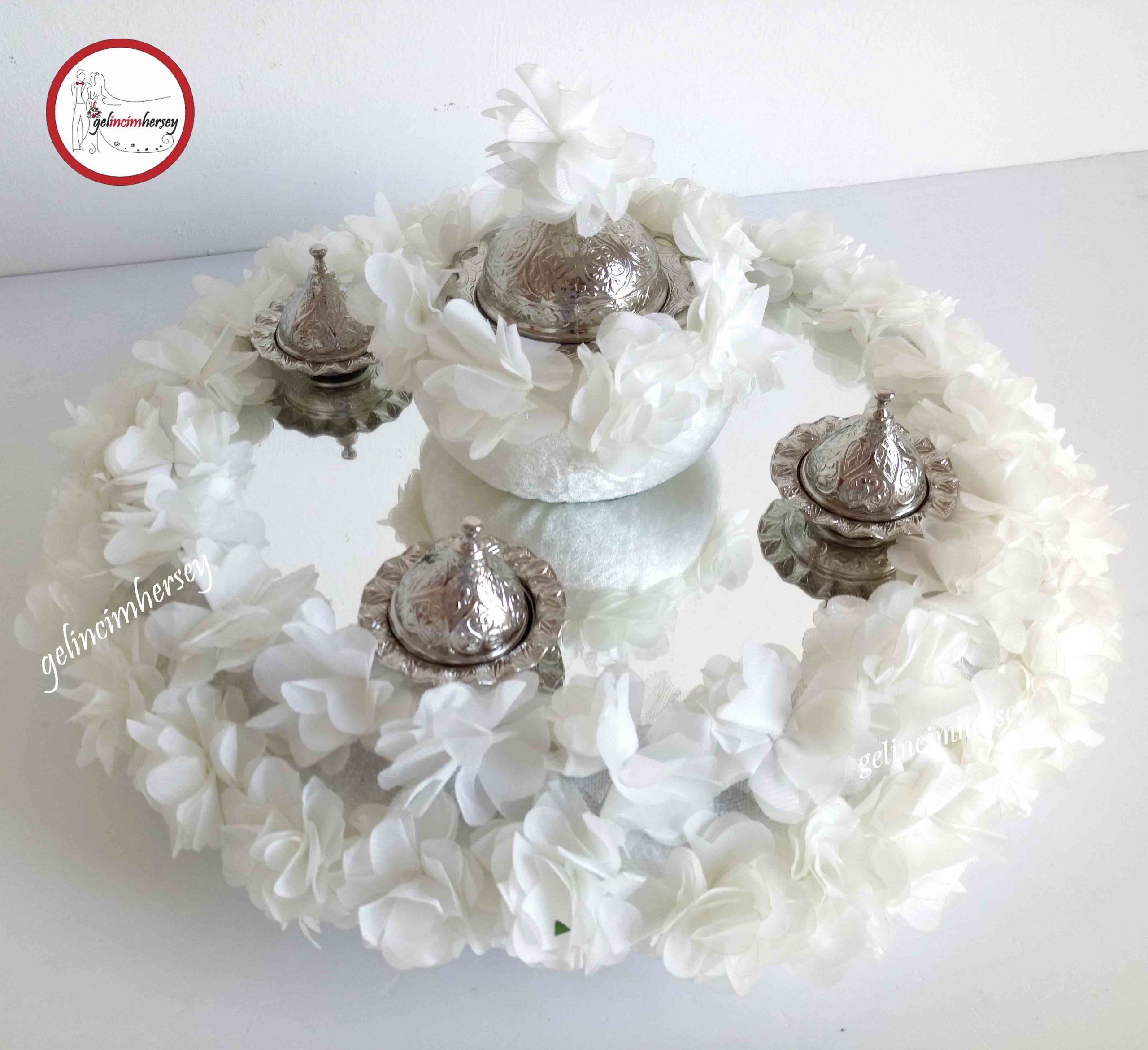 Gelincimherşey Beyaz Lazer Çiçekli Kadife Gümüş Süslemeli Aynalı Kına Sepeti ve Kına Tepsisi – Gelincimherşey