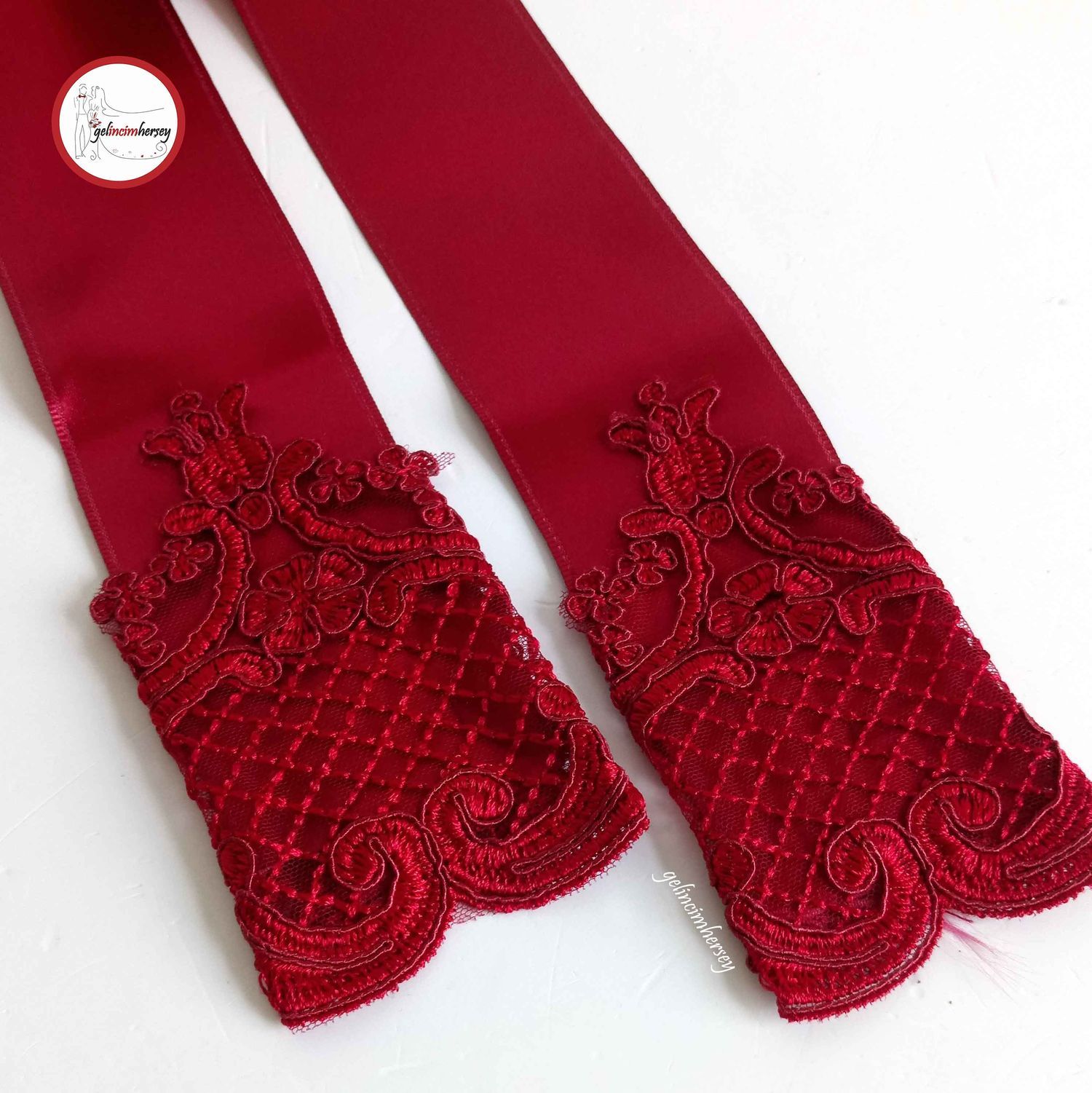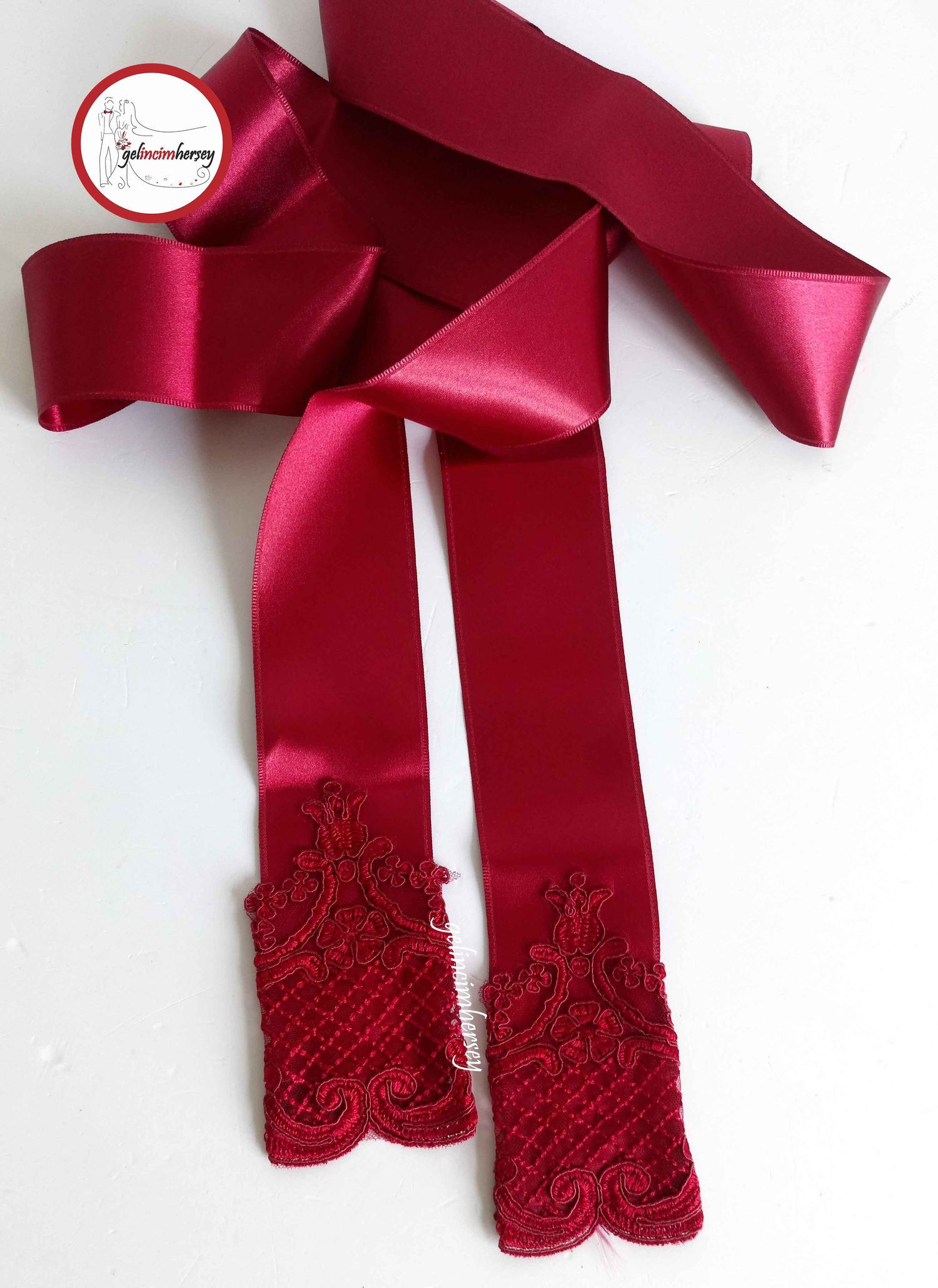 Gelincimherşey Bordo Fransız Dantel Uçlu Saten Gelin Kuşağı