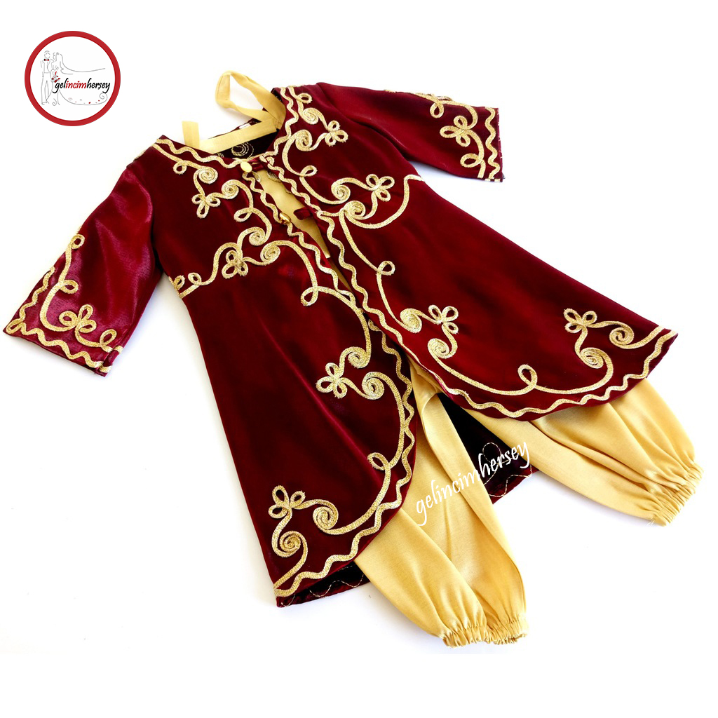 Minik prensesiniz için zarafeti ve geleneksel şıklığı bir araya getiren bu özel Bordo bindallı kostüm, gösterişli nakış detayları ve parlak monoray saten kumaşı ile göz kamaştırıyor.