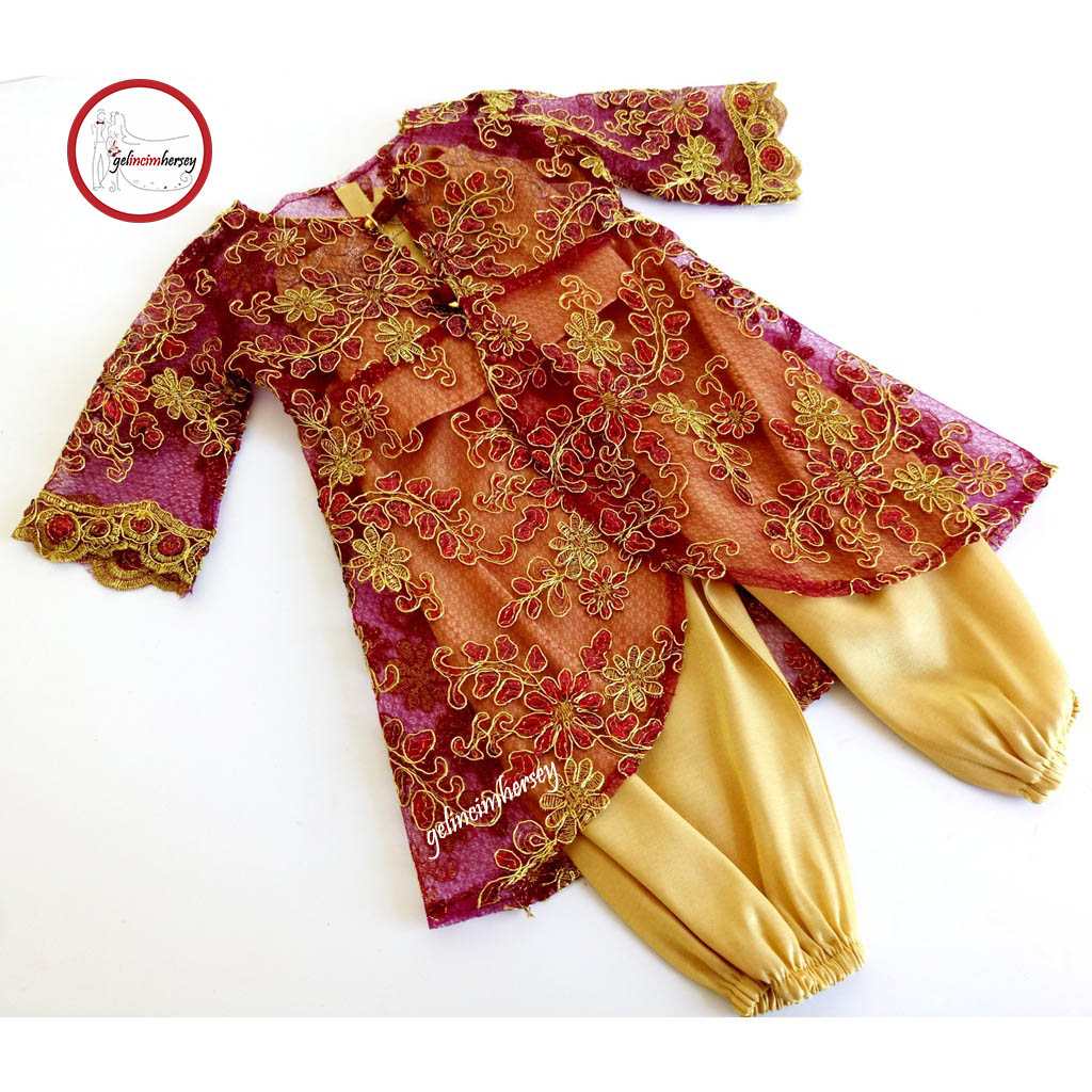 Küçük prensesiniz için geleneksel şıklığı keşfedin! Bordo tel kırma işlemeleriyle zarafetin en güzel halini yansıtan bu bindallıyı hemen sipariş edin.Yaş ve Stok durumuna göre ürün deseni değişiklik gösterebilir.