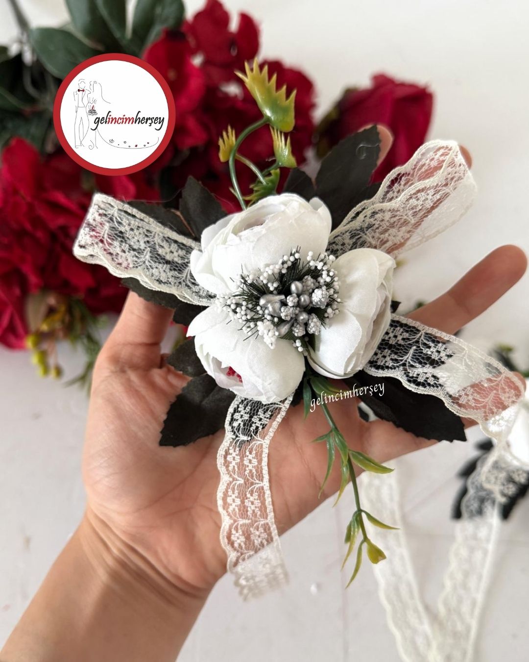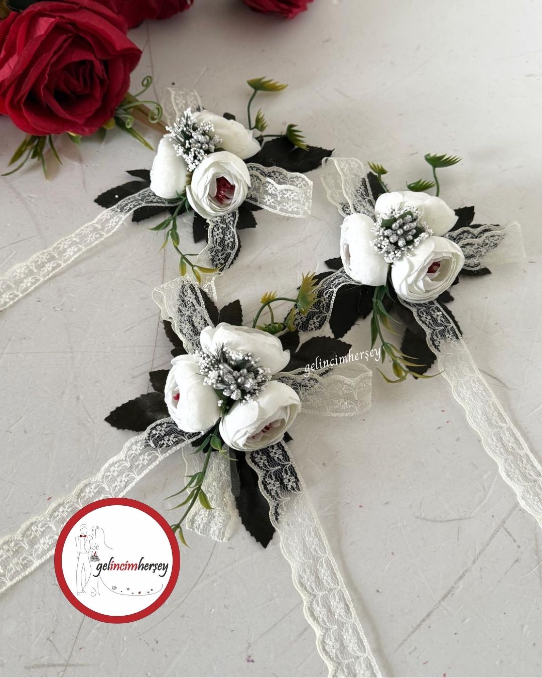 Çeyiz bohçalarınızı, nişan bohçalarınızı ya da özel hediye paketlerinizi süslemenin en zarif yolu: Çiçekli 3’lü Bohça Süsü. El işçiliğiyle özenle hazırlanan bu set, doğal görünümlü yapay çiçekler, dantel kurdeleler ve yeşil yaprak detaylarıyla şıklığı ön plana çıkarır.