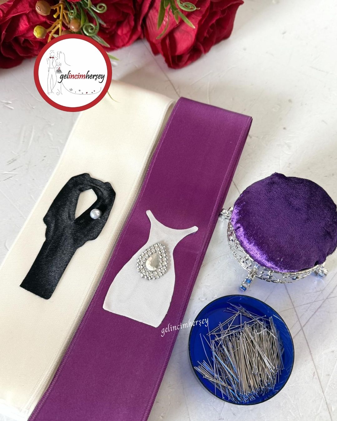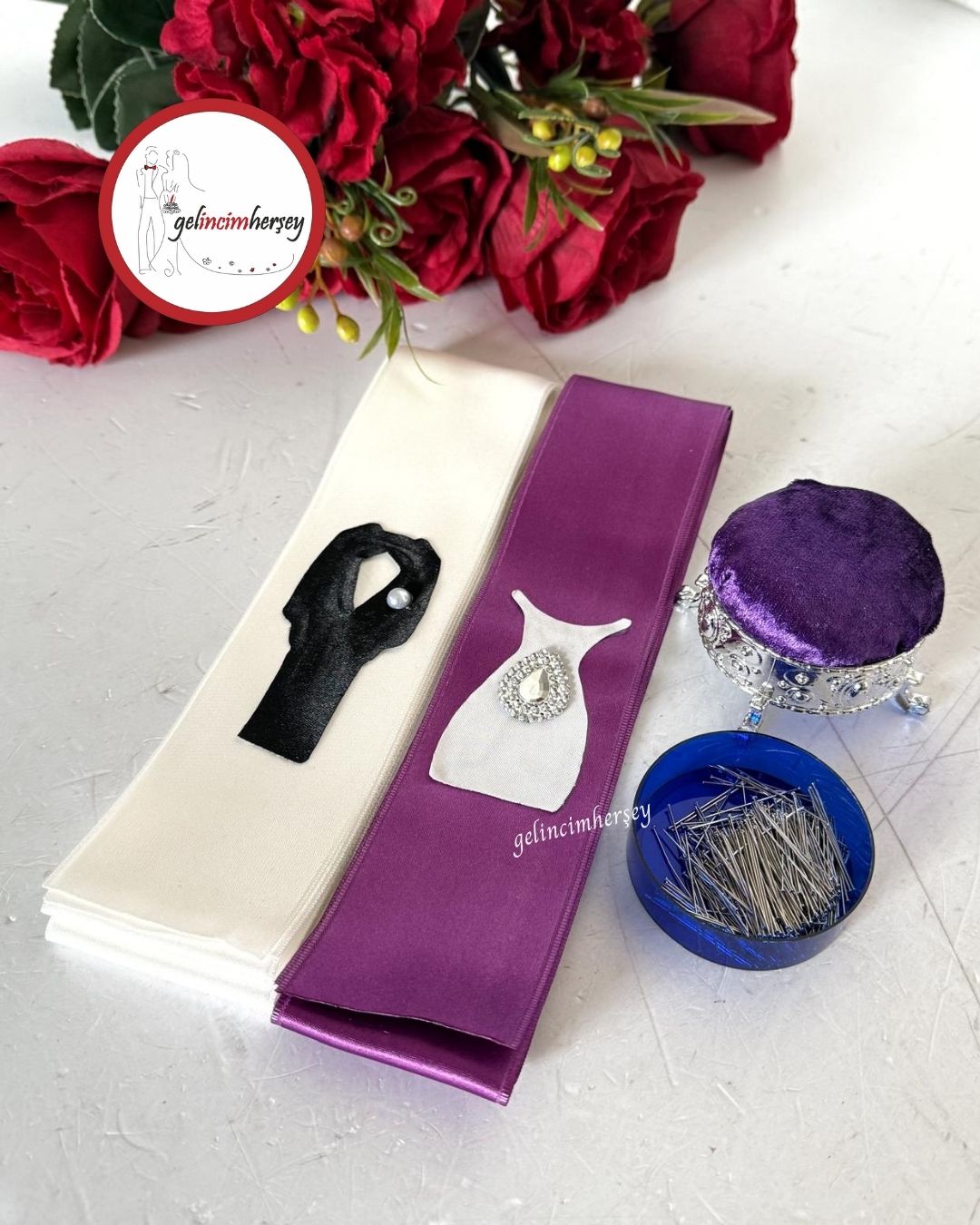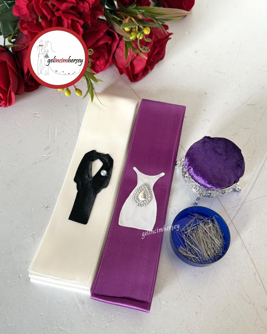Gelincimherşey gelin damat takı töreni için hazırlanan takı kurdelesi, iğnelik ve iğne seti; takı merasimlerinde şıklığı ve pratikliği bir arada sunar. Sade ve zarif tasarımı sayesinde göz yormaz, tören alanında düzenli ve estetik bir görünüm sağlar.