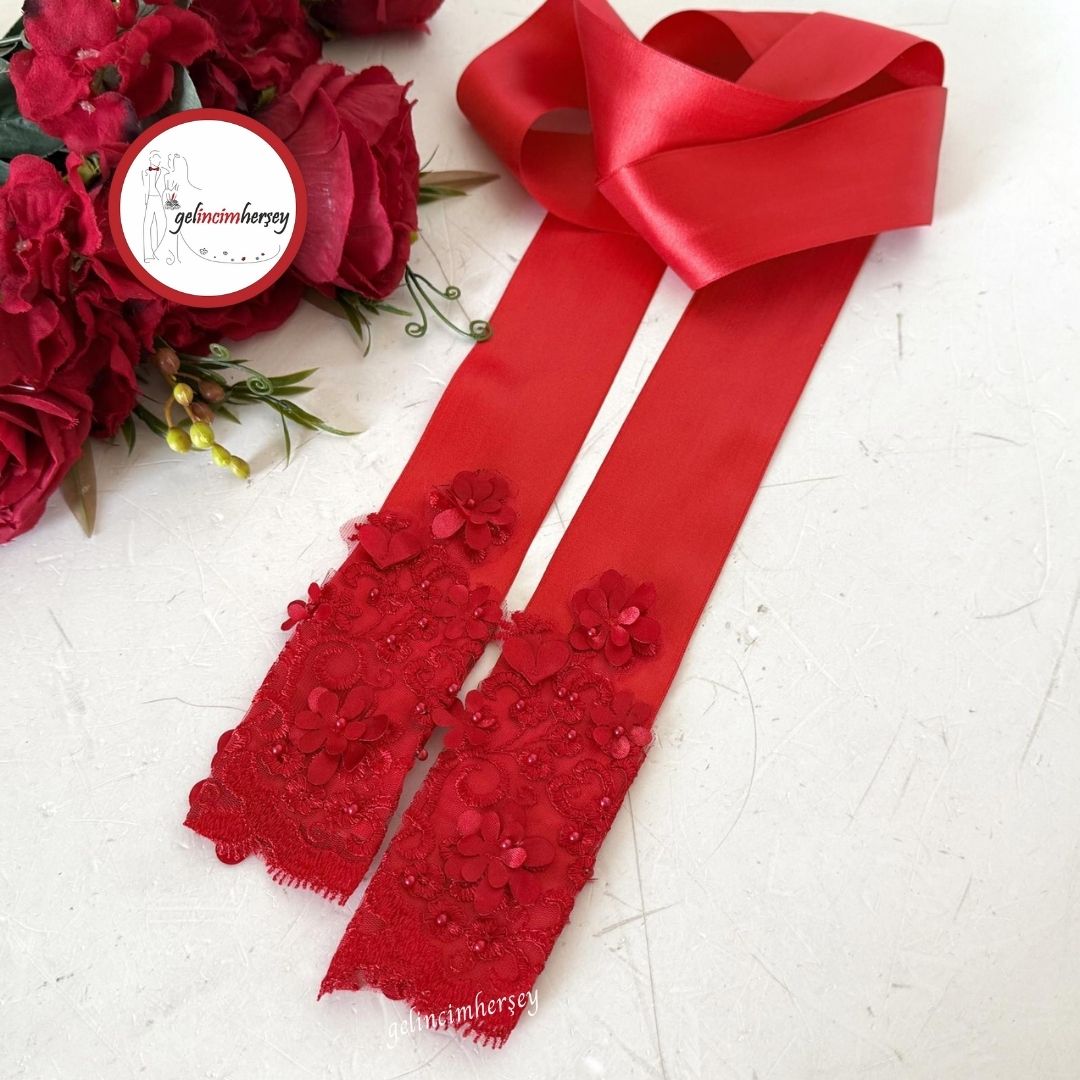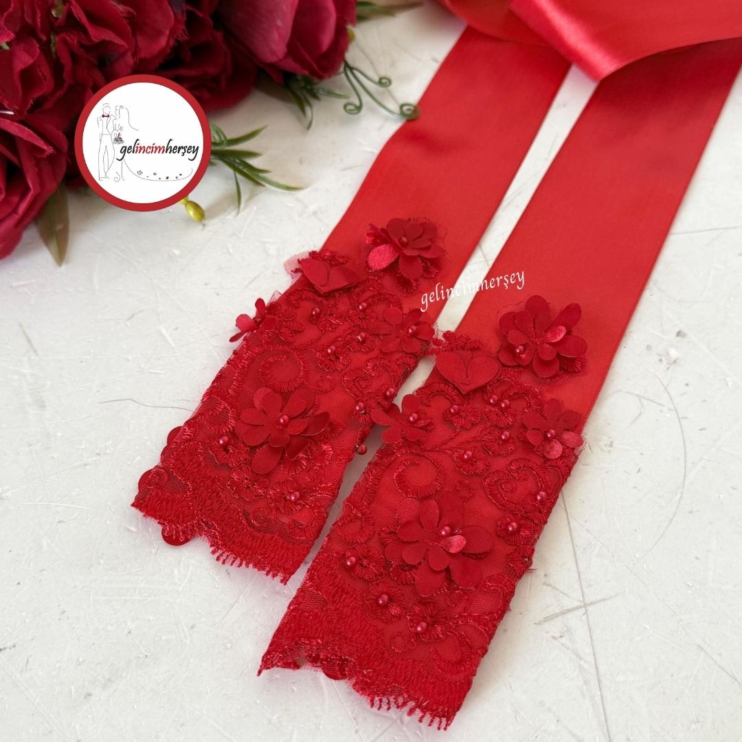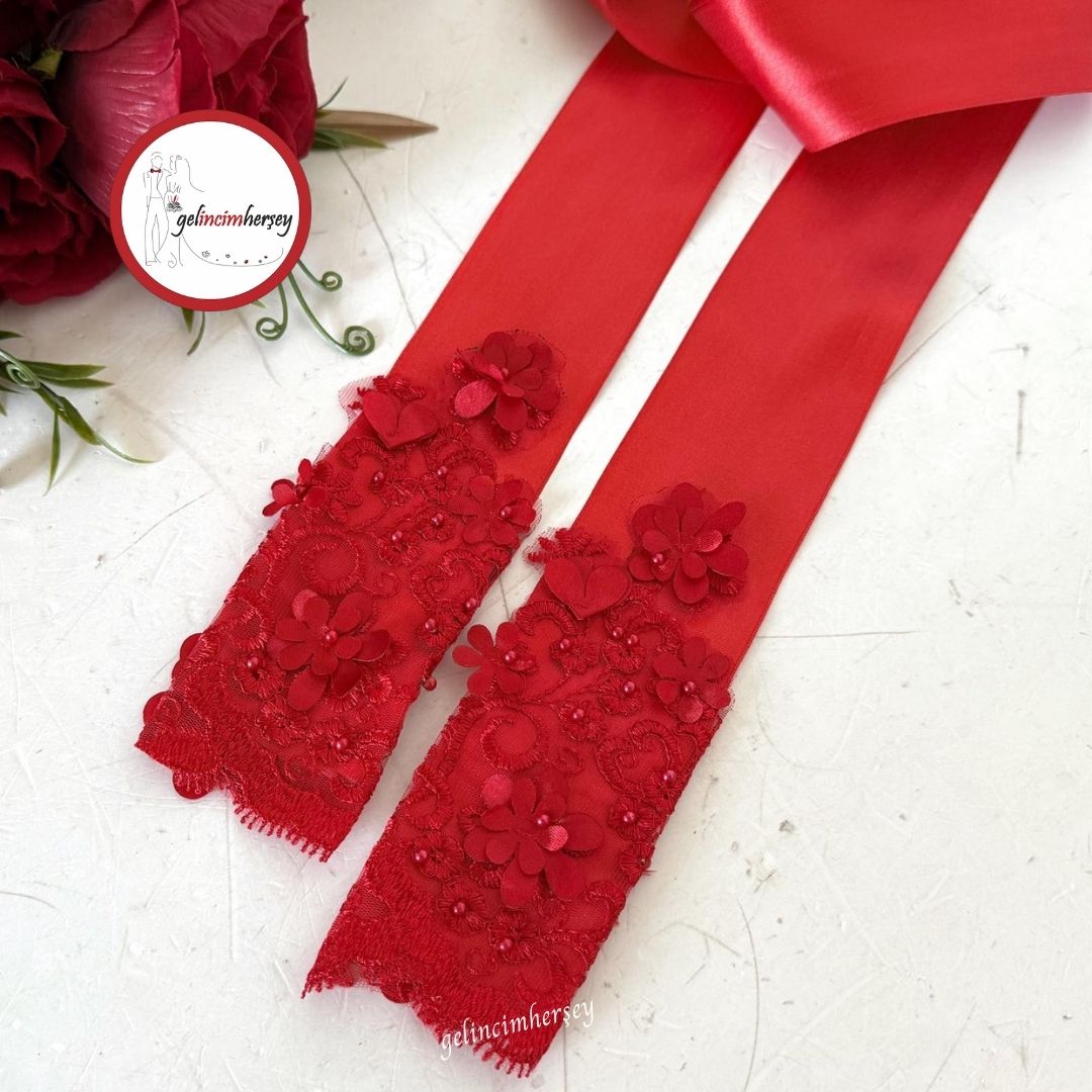 Gelincimherşey Gelin İçin 3 Boyutlu Dantel Uçlu Saten Gelin Kuşağı