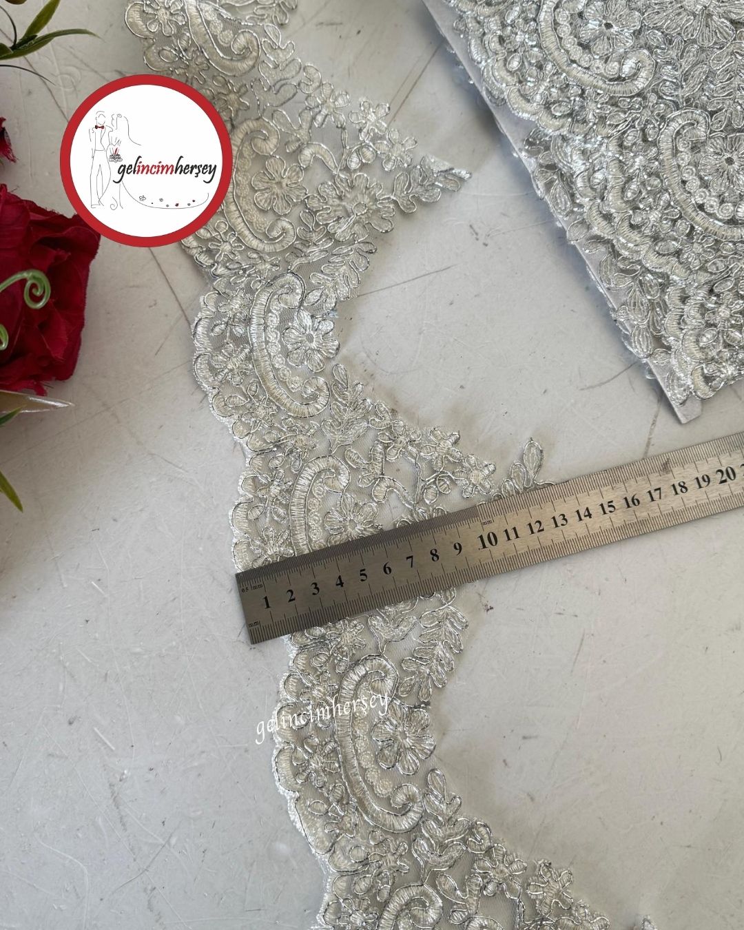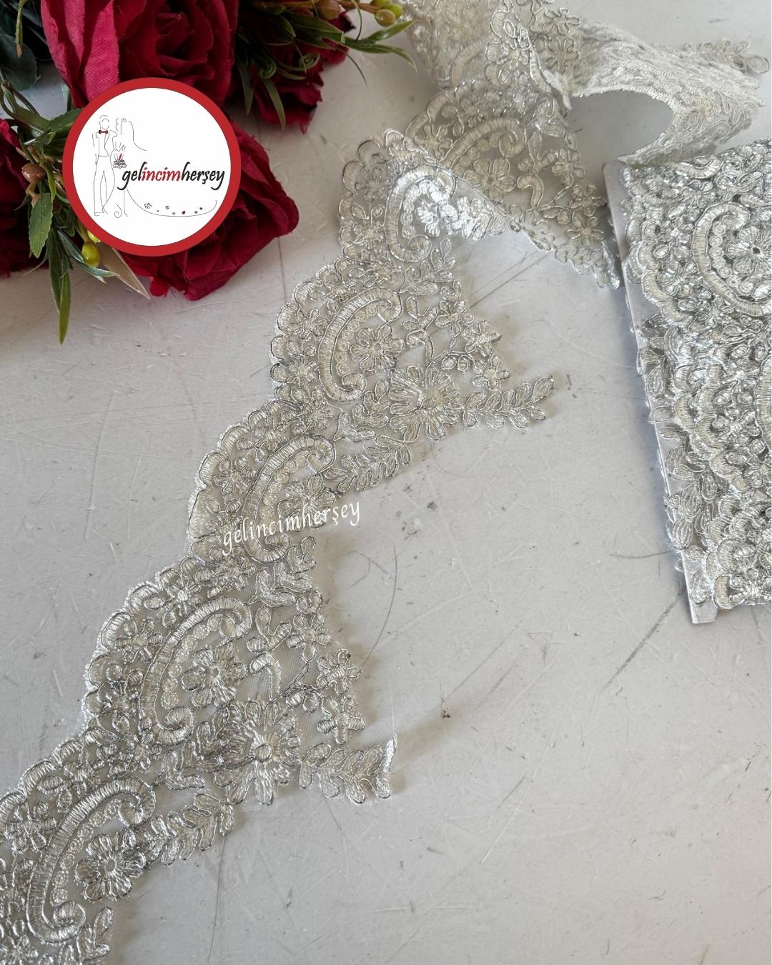 Gelincimherşey gümüş kordineli kırık beyaz Fransız güpür 13.5 cm genişliğinde ve 4 metre uzunluğunda olup çeyiz, bohça ve tasarım süslemeleri için idealdir.