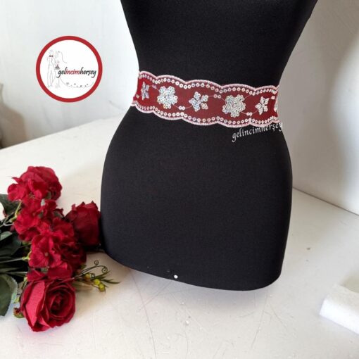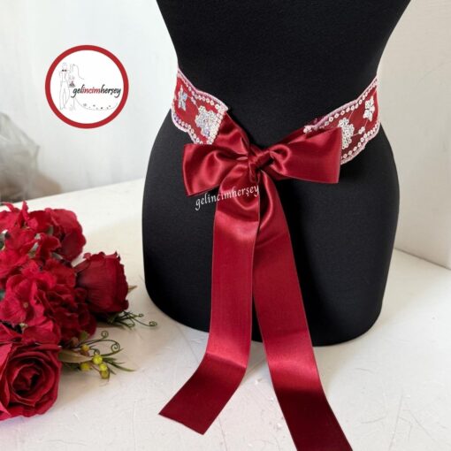 Özel günlerinize zarif bir dokunuş katın! Gümüş renkli pul ve çiçek desenli işleme detaylarına sahip bu gelin kuşağı, kaliteli bordo saten kurdele ile tamamlanmıştır. Düğün, nişan ve evden çıkış törenlerinde gelin adaylarına hem zarafet hem de anlam katan şık bir aksesuardır.