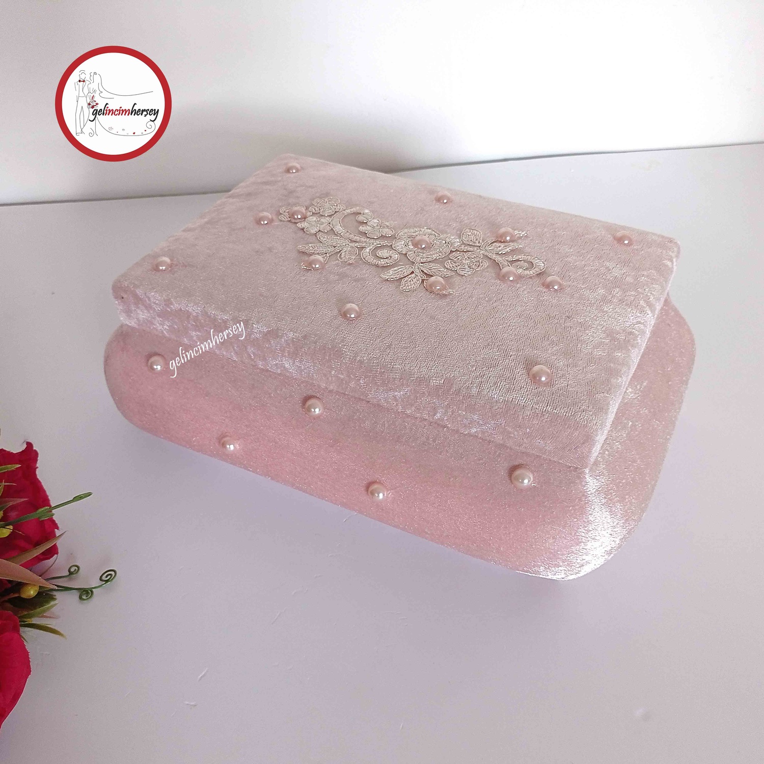 Gelincimherşey Kadife Kaplama Güpür ve İnci Süslemeli Makyaj Sandığı