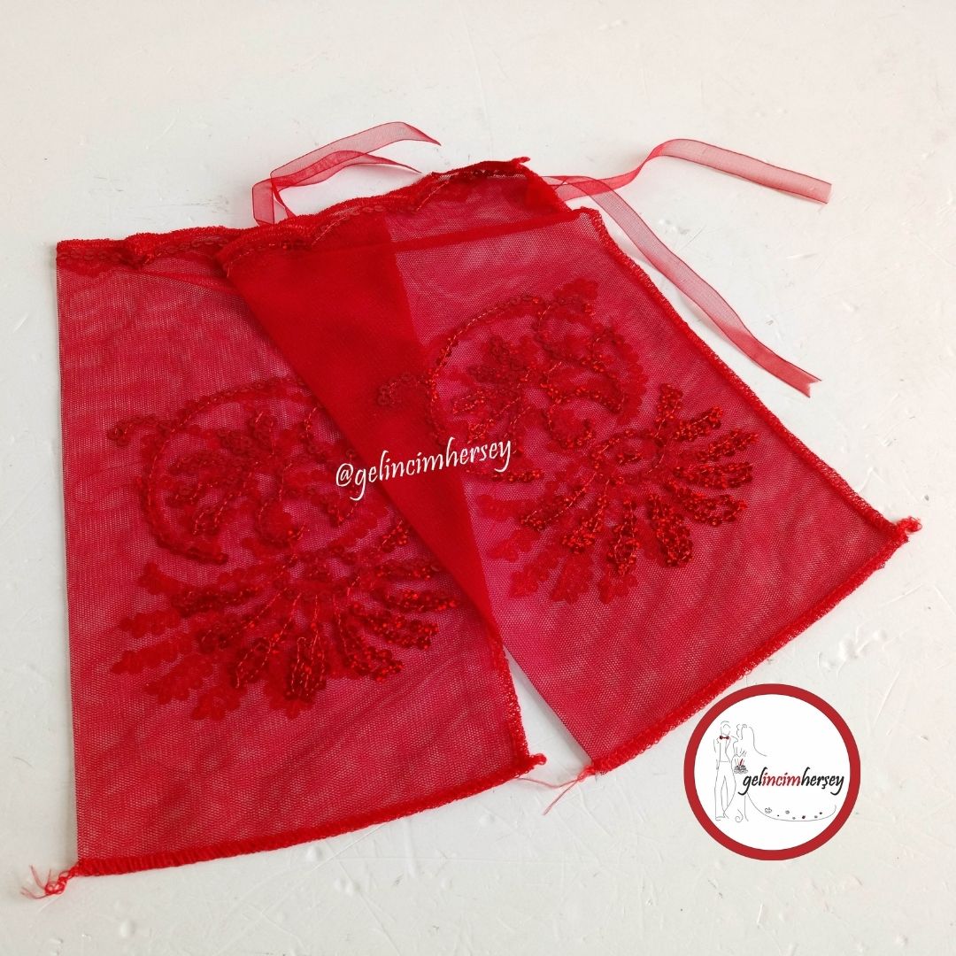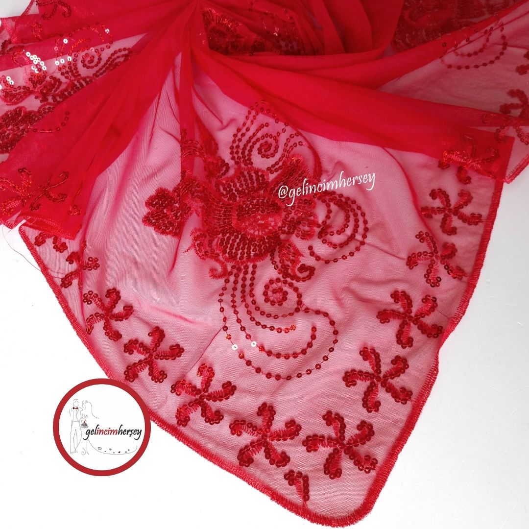 Kına gecelerinin ve özel törenlerin olmazsa olmazı olan kırmızı pul payet işlemeli gelin duvağı, ihtişamlı görünümüyle gelin adaylarının zarafetini tamamlar. Payet işlemeler ışıkta parlayarak dikkat çekici bir şıklık sunarken, kırmızının asaletini ön plana çıkarır.