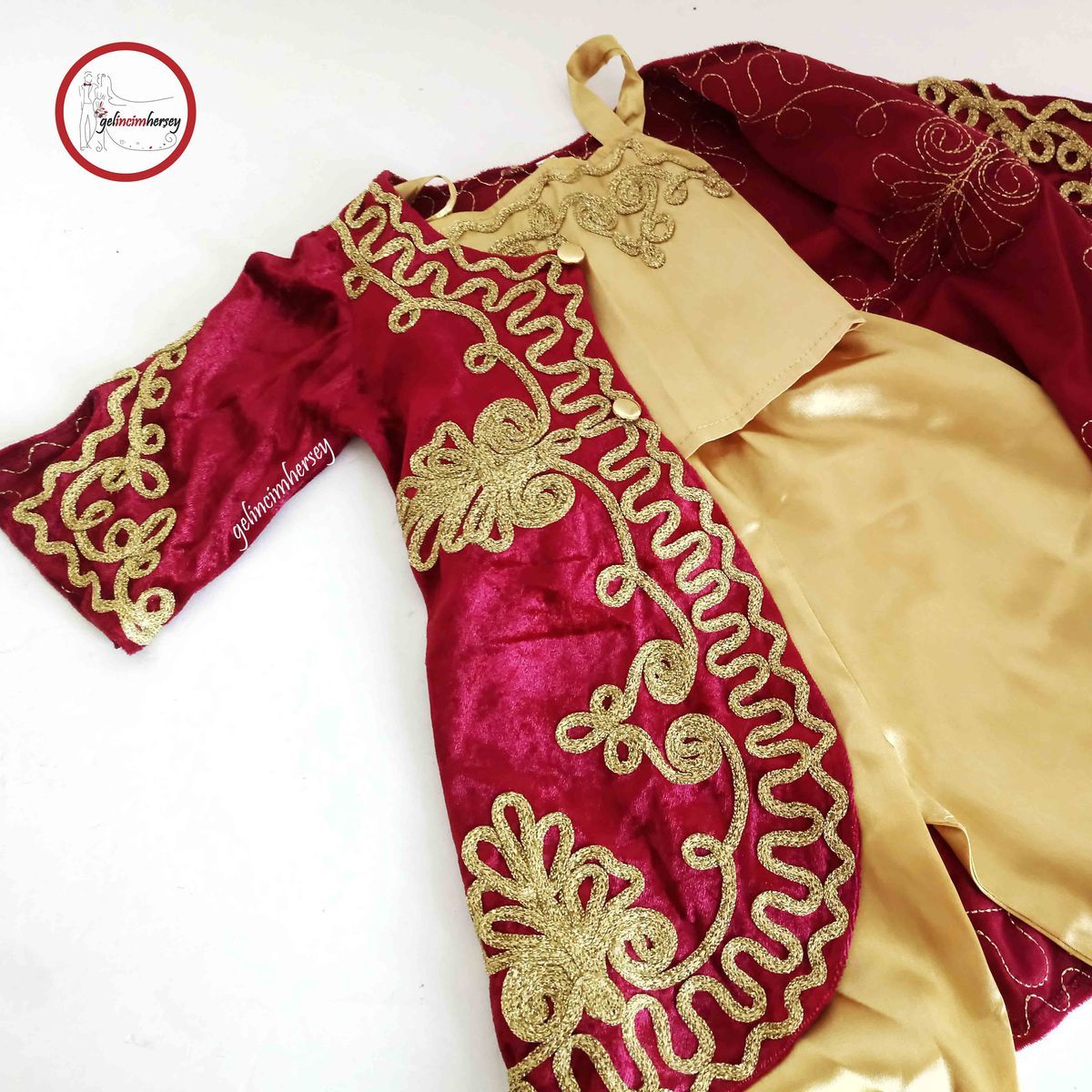 Minik prensesiniz için zarafeti ve geleneksel şıklığı bir araya getiren bu özel Bordo bindallı kostüm, gösterişli nakış detayları ve parlak monoray saten kumaşı ile göz kamaştırıyor.