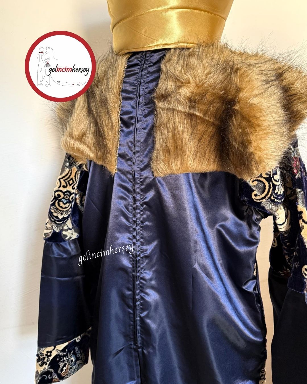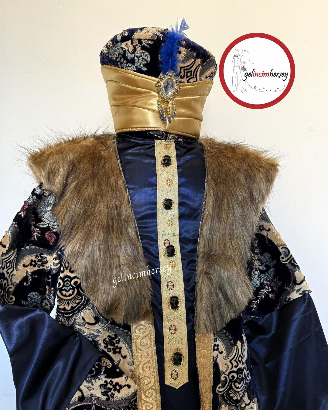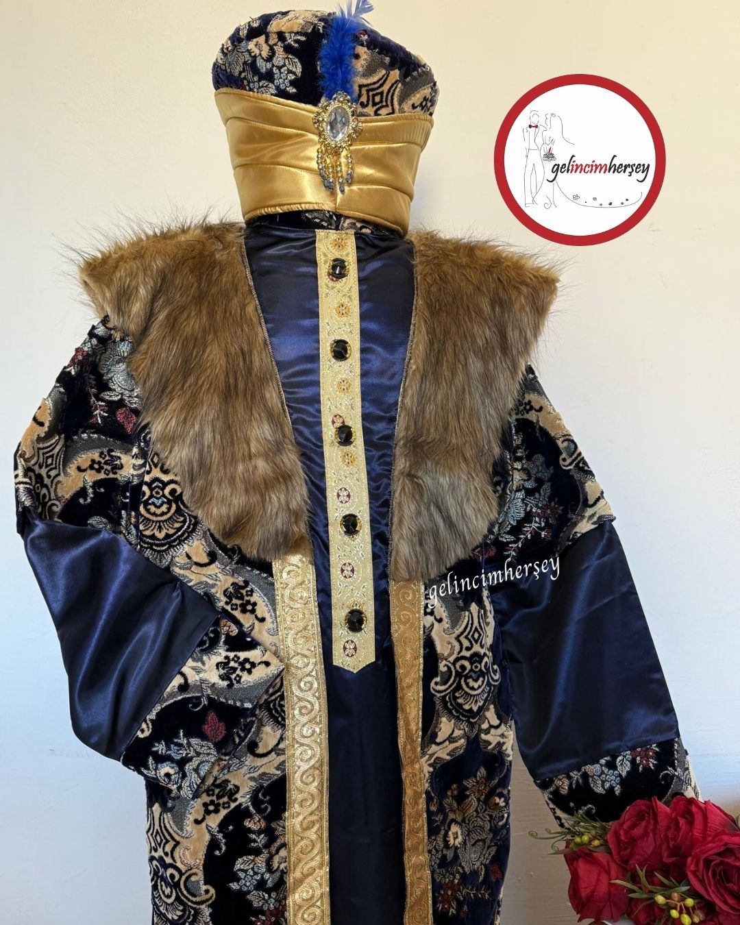 Gelincimherşey Lacivert Profesyonel Kalite Osmanlı Dönemi Padişah Kostümü, arkadan fermuarlı ve standart kalıp tasarımıyla tiyatro, kına gecesi, kültürel etkinlik ve fotoğraf çekimleri için uygundur.