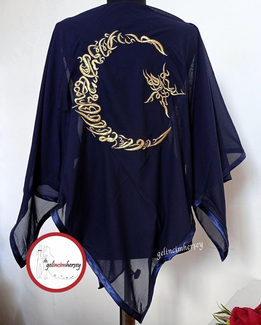 Gelincimherşey Lacivert Şifon Kumaş Biyeli Ay Yıldız Nakışlı Damat Duvağı – Kına Gecelerinin Eğlenceli Klasiği