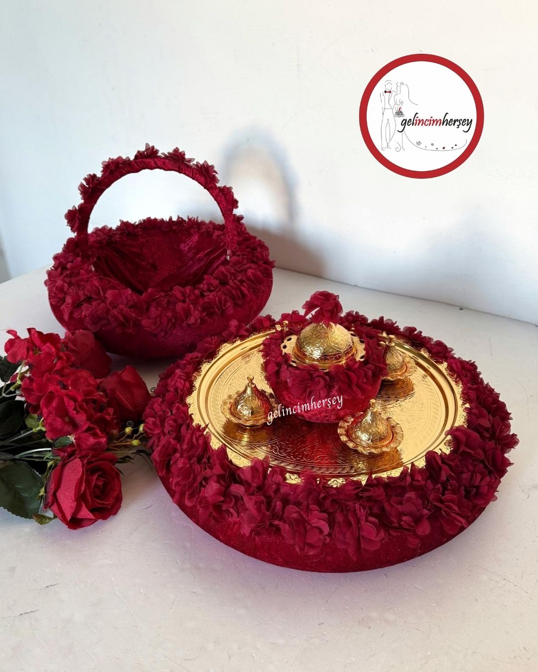 Gelincimherşey Kadife Kaplama Lazer Çiçek Süslemeli Metal Tepsili Kına Sepeti ve Kına Tepsisi