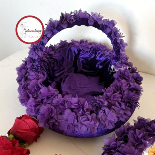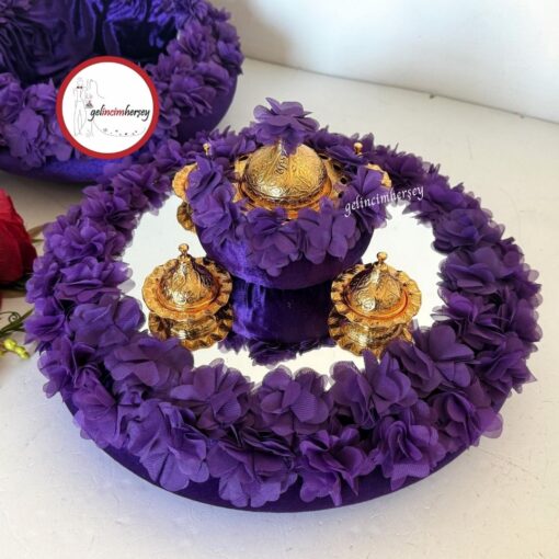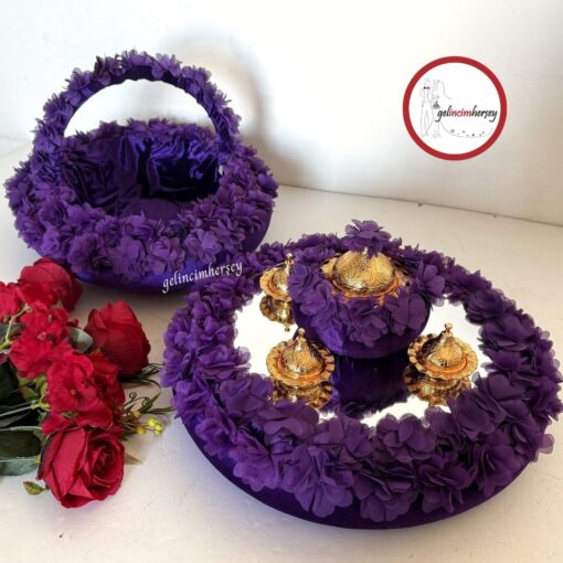 Gelincimherşey Lazer Çiçekli Kadife Süslemeli Aynalı Kına Sepeti ve Kına Tepsisi