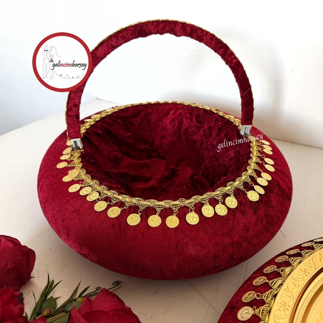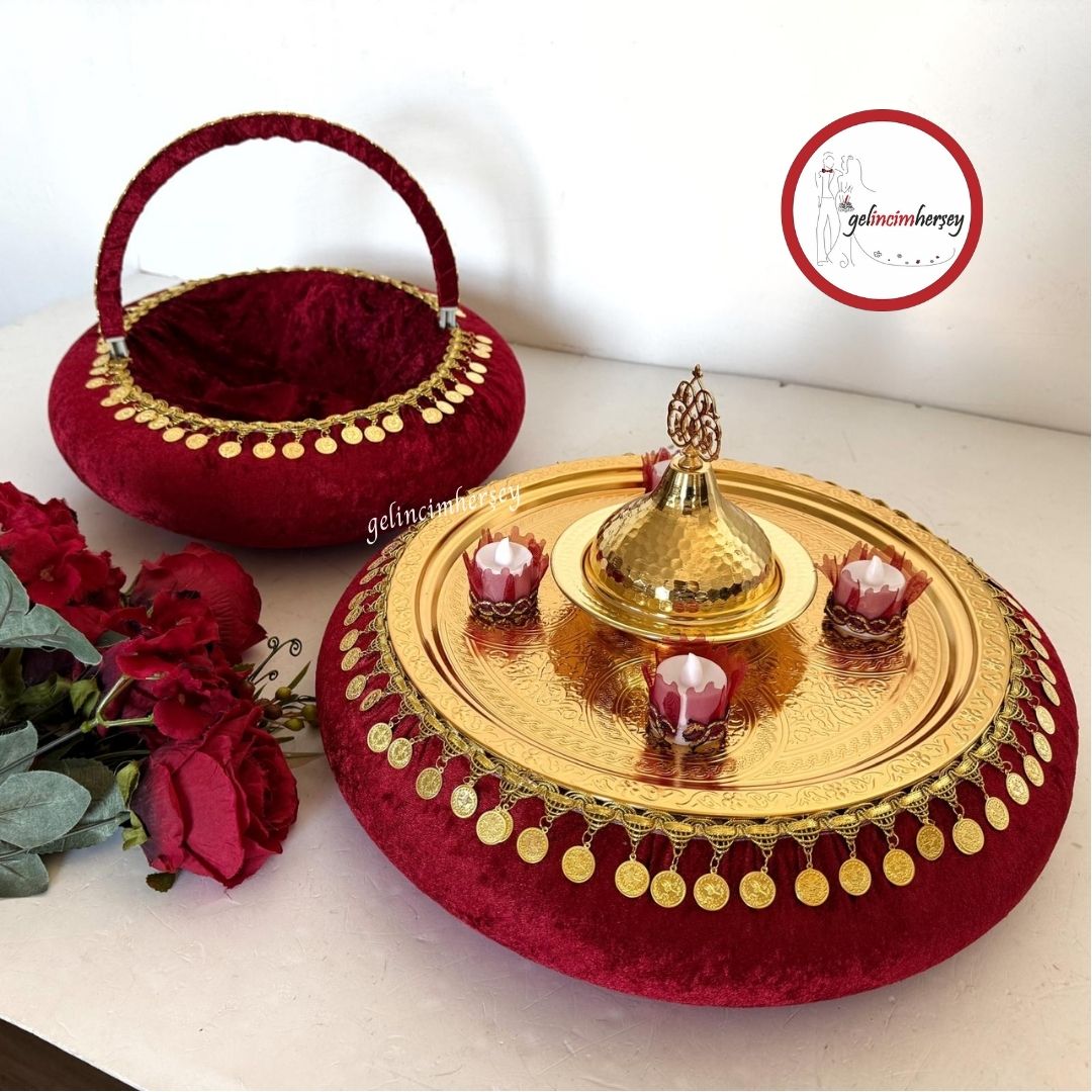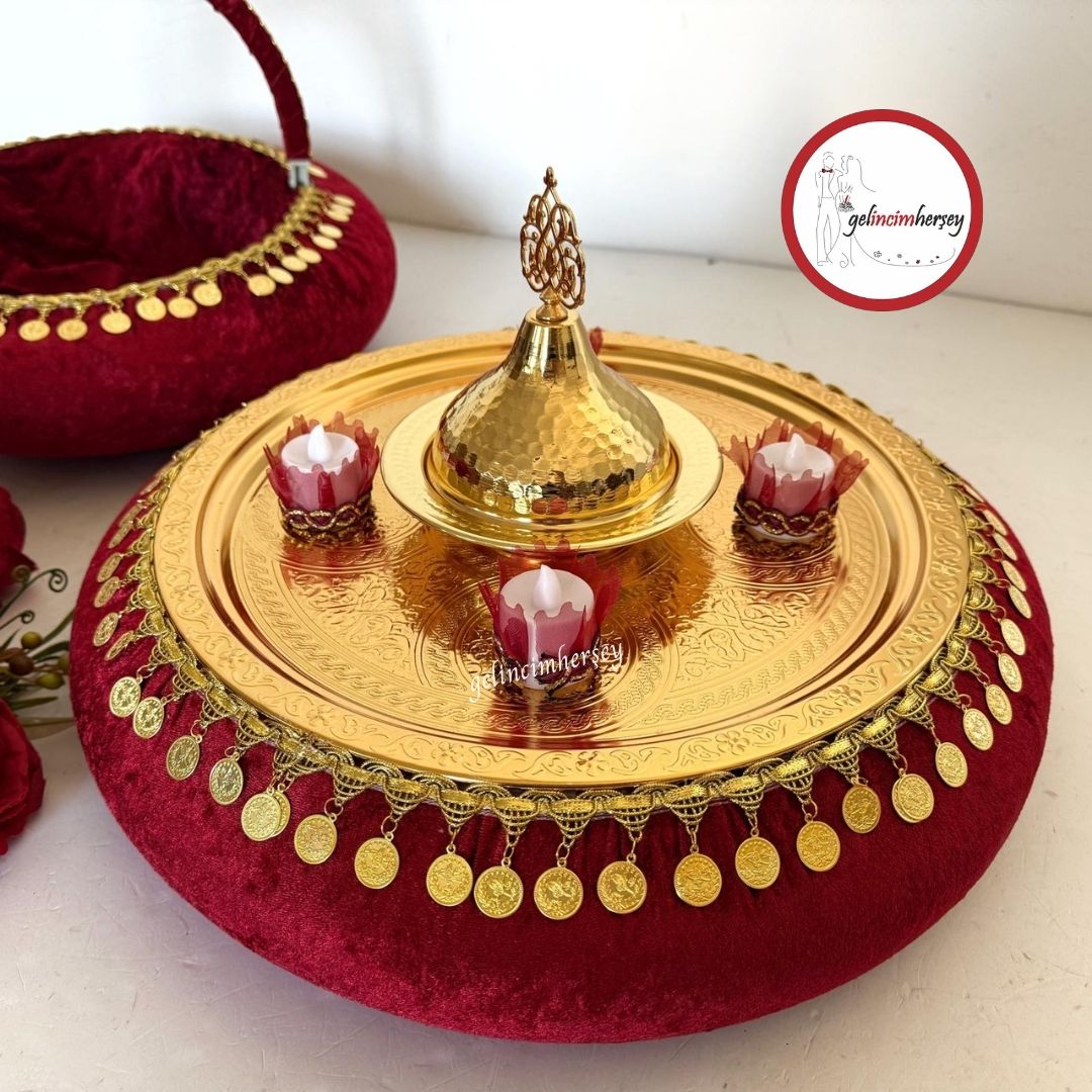 Geleneksel Türk kına gecelerine özel olarak tasarlanmış, kadife kumaşla kaplanmış ve altın rengi lira detaylarıyla süslenmiş kına tepsisi ve kına sepeti setidir. Şık ve göz alıcı tasarımıyla kına organizasyonları için idealdir.