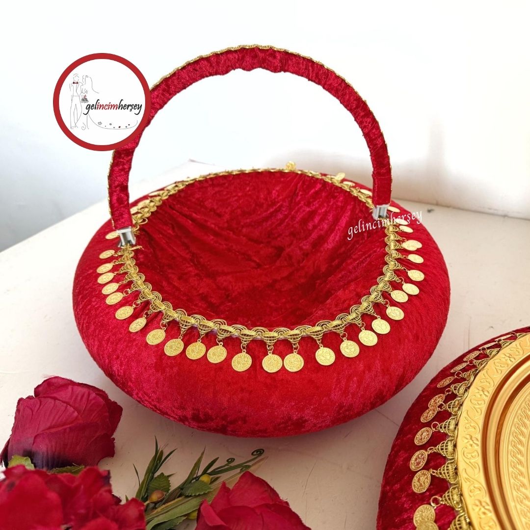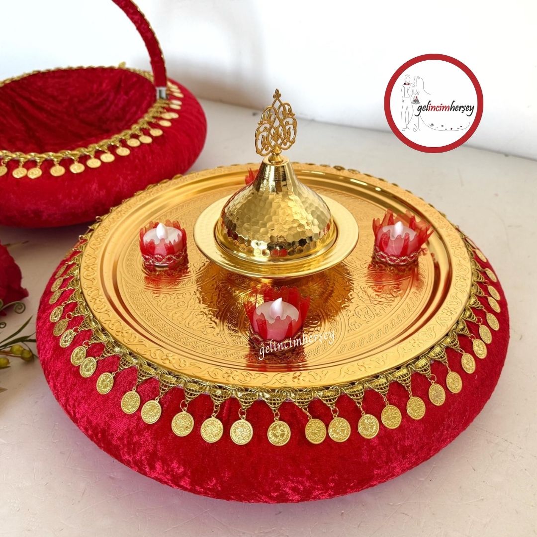Geleneksel Türk kına gecelerine özel olarak tasarlanmış, kadife kumaşla kaplanmış ve altın rengi lira detaylarıyla süslenmiş kına tepsisi ve kına sepeti setidir. Şık ve göz alıcı tasarımıyla kına organizasyonları için idealdir.