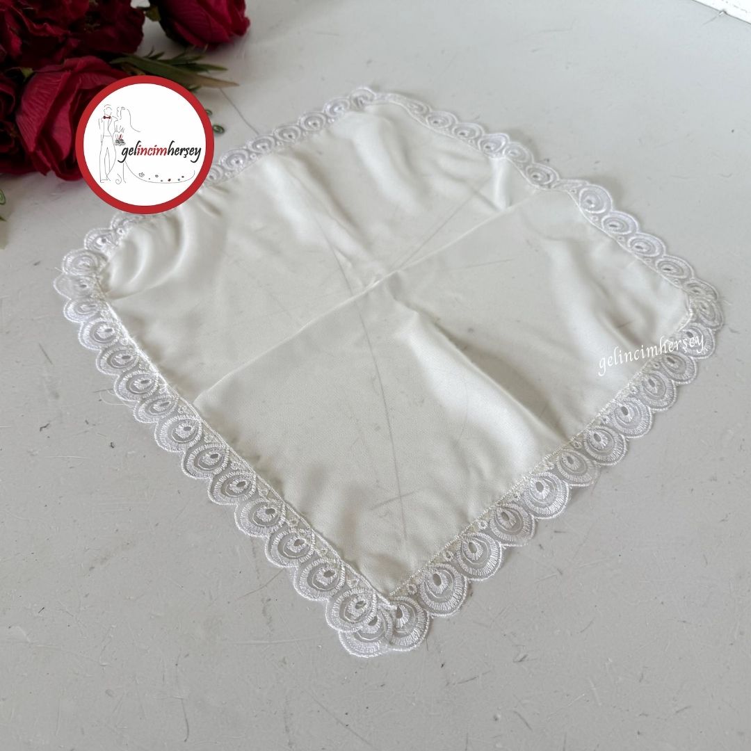 Söz ve nişan merasimlerinin en zarif tamamlayıcılarından biri olan güpür detaylı şifon söz mendili, özel tasarımı ve yumuşacık dokusuyla öne çıkar. Şifon kumaş üzerine işlenen romantik organze göz güpür süslemesi ile geleneksel detaylara modern bir dokunuş sunar.