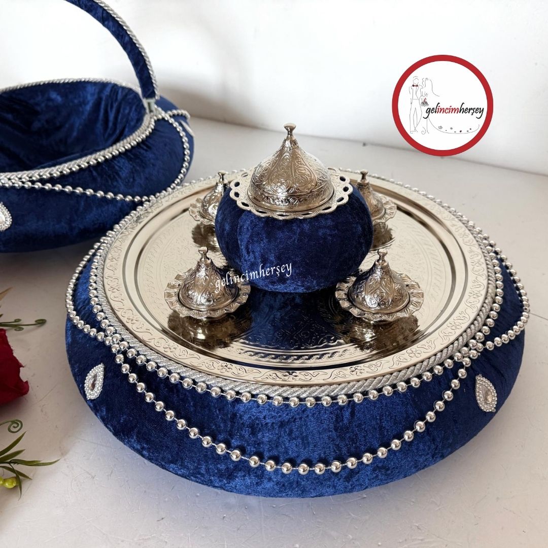 Gelincimherşey Osmanlı Model Gümüş Metal Tepsili Kadife Boncuklu Kına Sepeti ve Kına Tepsisi