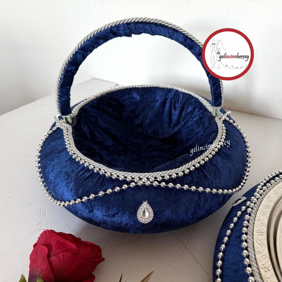 Set İçeriği: 1 adet kadife kaplama kına sepeti + 1 adet gümüş metal tepsiden kına tepsisi