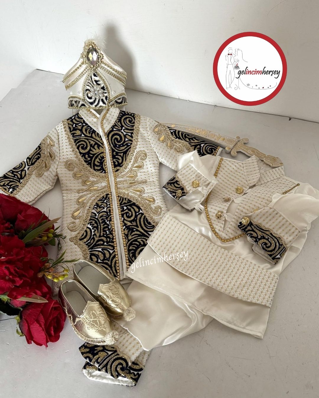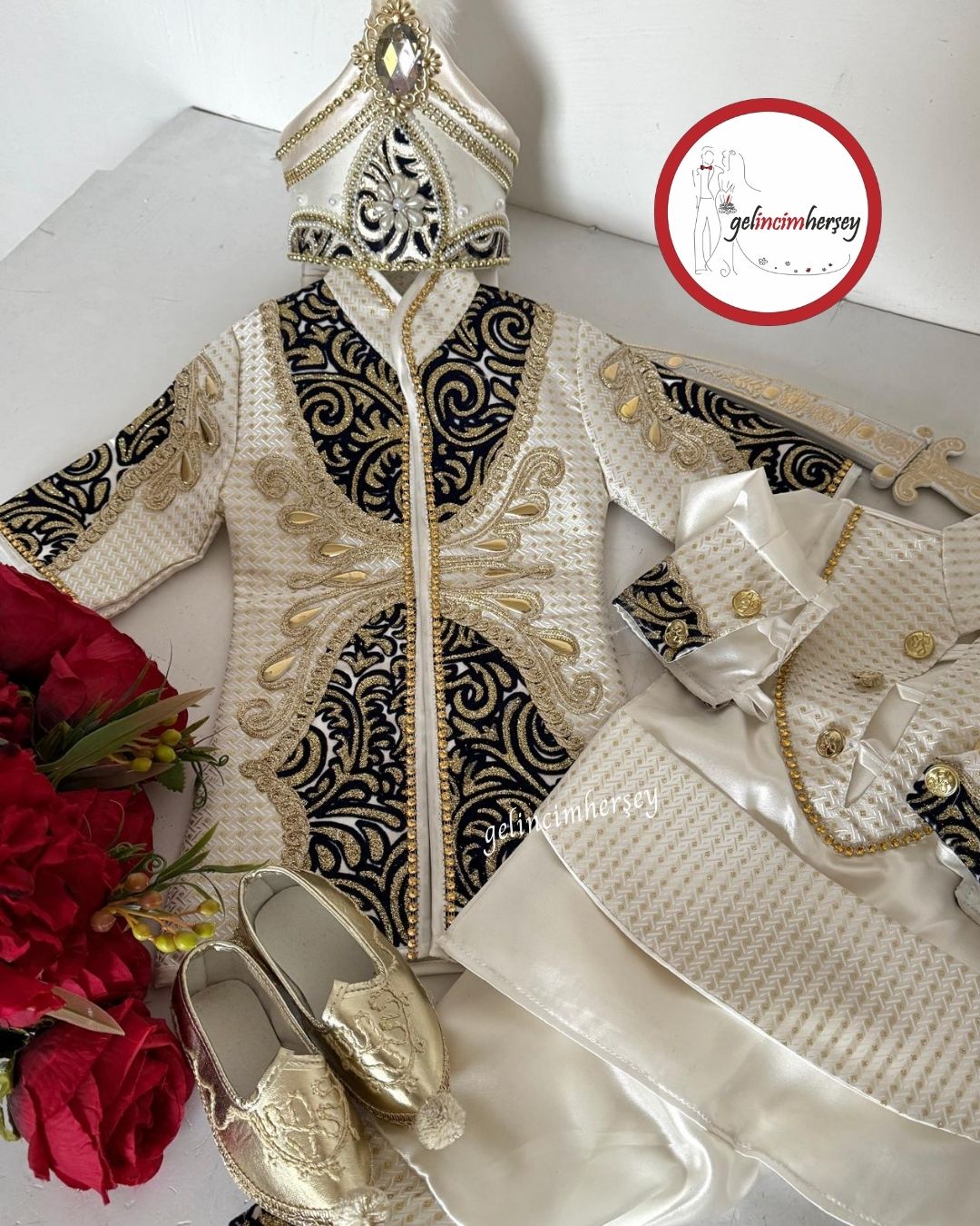 Osmanlı şehzadelerinden ilham alınarak tasarlanan bu özel model, zengin işlemeleri ve taş detayları ile lüks bir duruş sergiler. Lacivertin asilliği ile gold detayların ihtişamı birleşerek fotoğraf çekimlerinde ve organizasyonlarda dikkat çeken bir stil oluşturur.