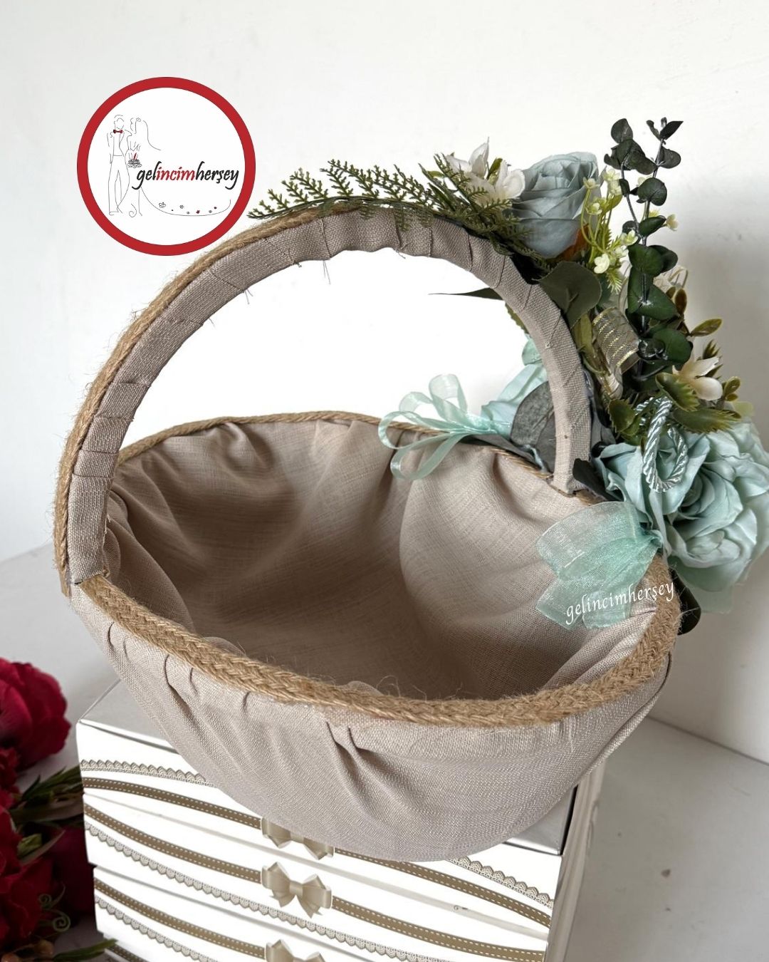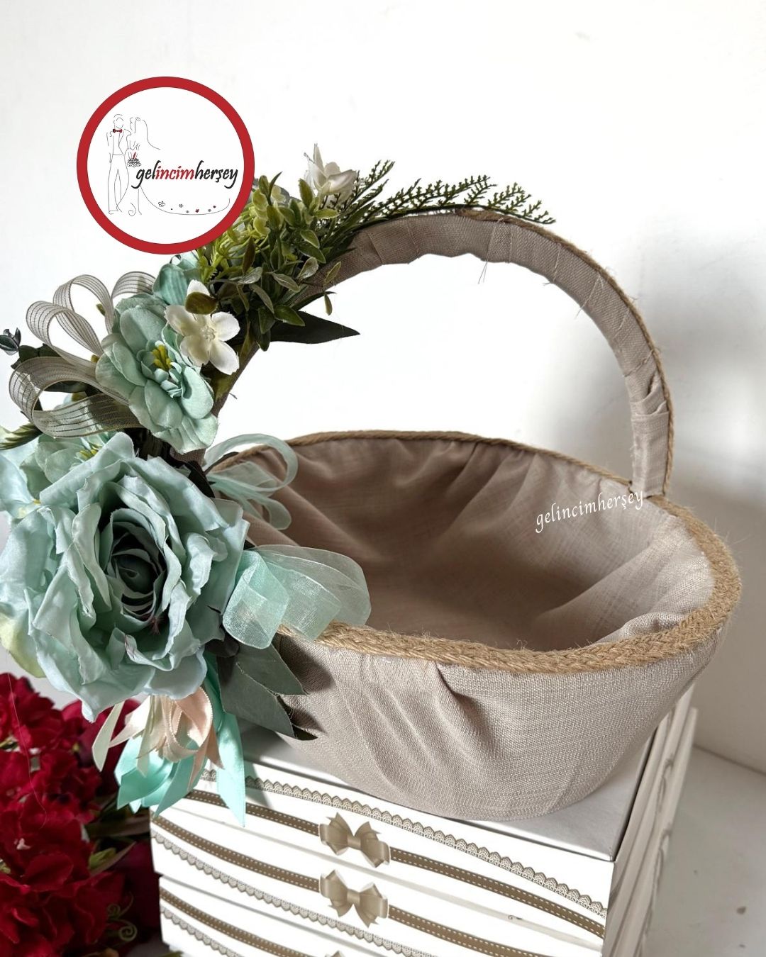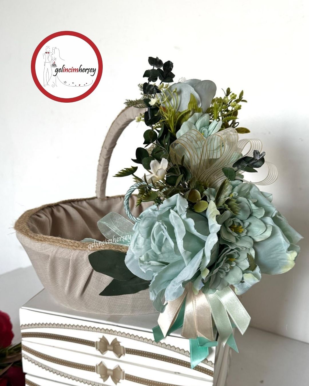 Gelincimherşey tarafından özenle tasarlanan ithal yapay Su Yeşili çiçekli hediyelik sepet, söz, nişan ve düğün törenlerinde hem estetik hem de anlamlı bir sunum oluşturmak isteyenler için hazırlanmıştır.