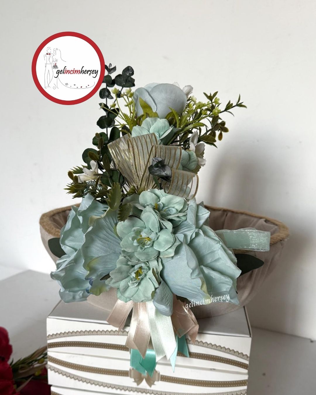 Gelincimherşey Özel Tasarım İthal Yapay Su Yeşili Çiçekli Söz Nişan Düğün Hediyelik Sepeti