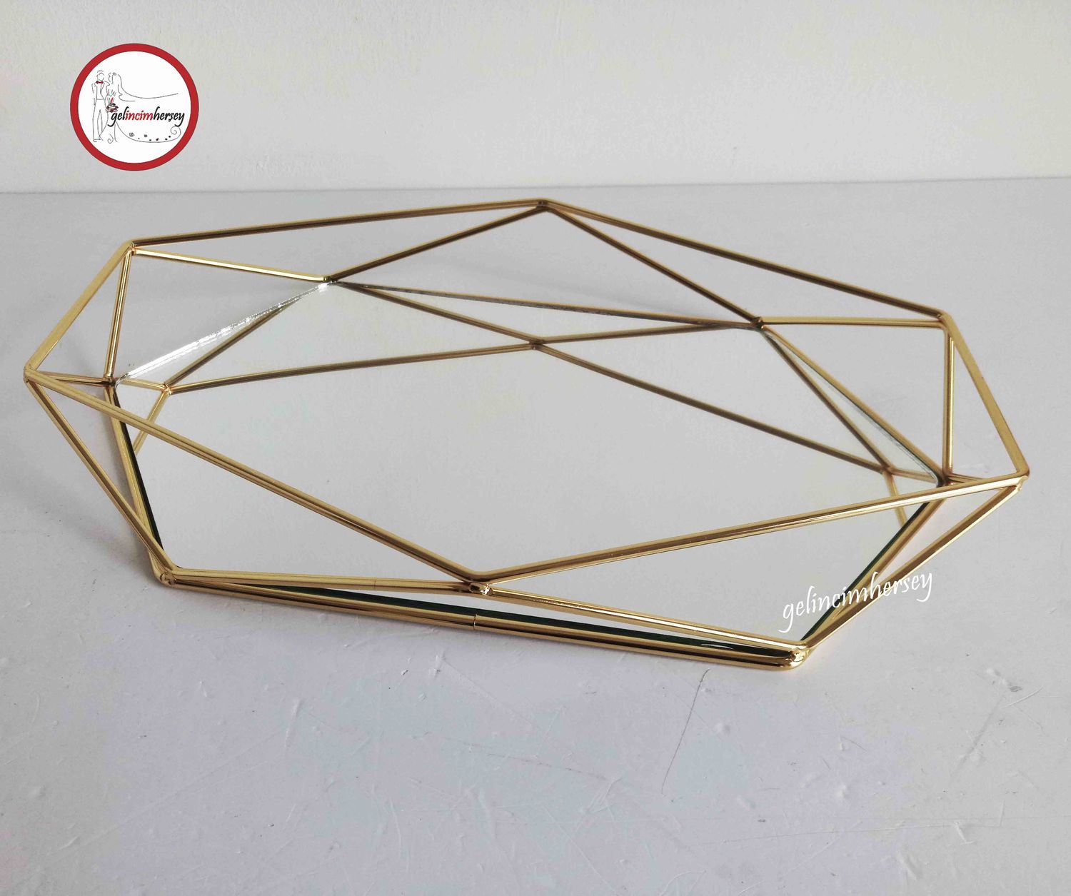 Tasarım: Prizma şeklinde çerçeveye sahip, orta kısmı tam ayna kaplamalı lüks sunum tepsisi.