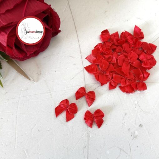El işleri, davetiye süsleme, nikah şekeri, hediye paketleme ve dekoratif çalışmalar için ideal olan saten minik fiyonk kurdeleler ile tasarımlarınıza zarif bir dokunuş katın. Dikişli yapısı sayesinde formunu koruyan bu minik fiyonklar, pratik ve şık kullanım sağlar.