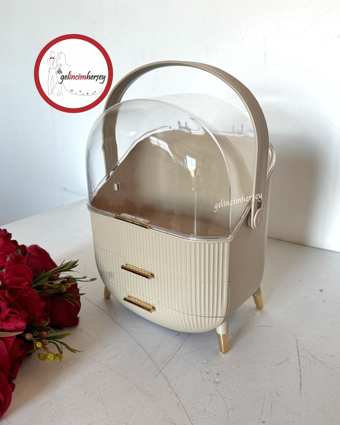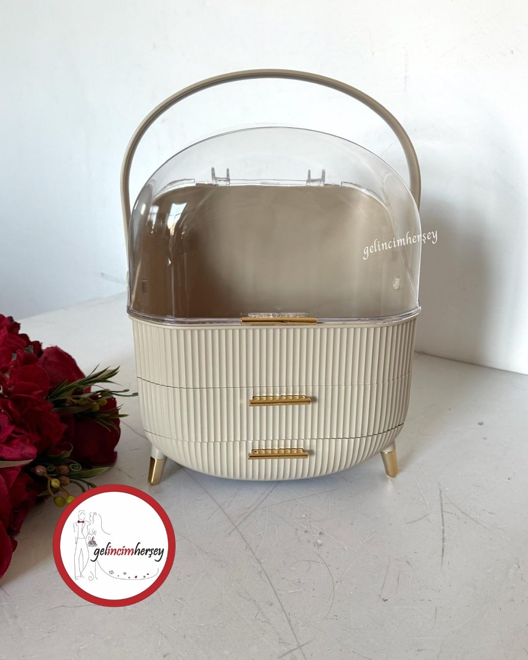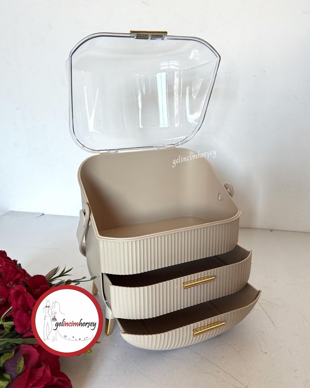 Gelincimherşey şeffaf kapaklı çekmeceli makyaj organizeri, gelin hazırlık sürecinde ve özel günlerde kullanılan makyaj malzemeleri ile küçük aksesuarları düzenli şekilde saklamak için tasarlanmıştır.