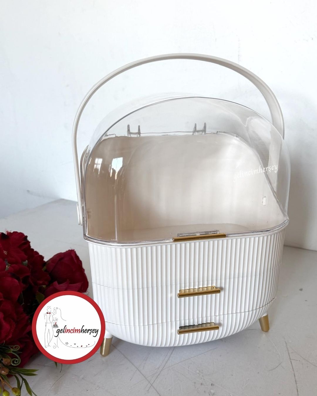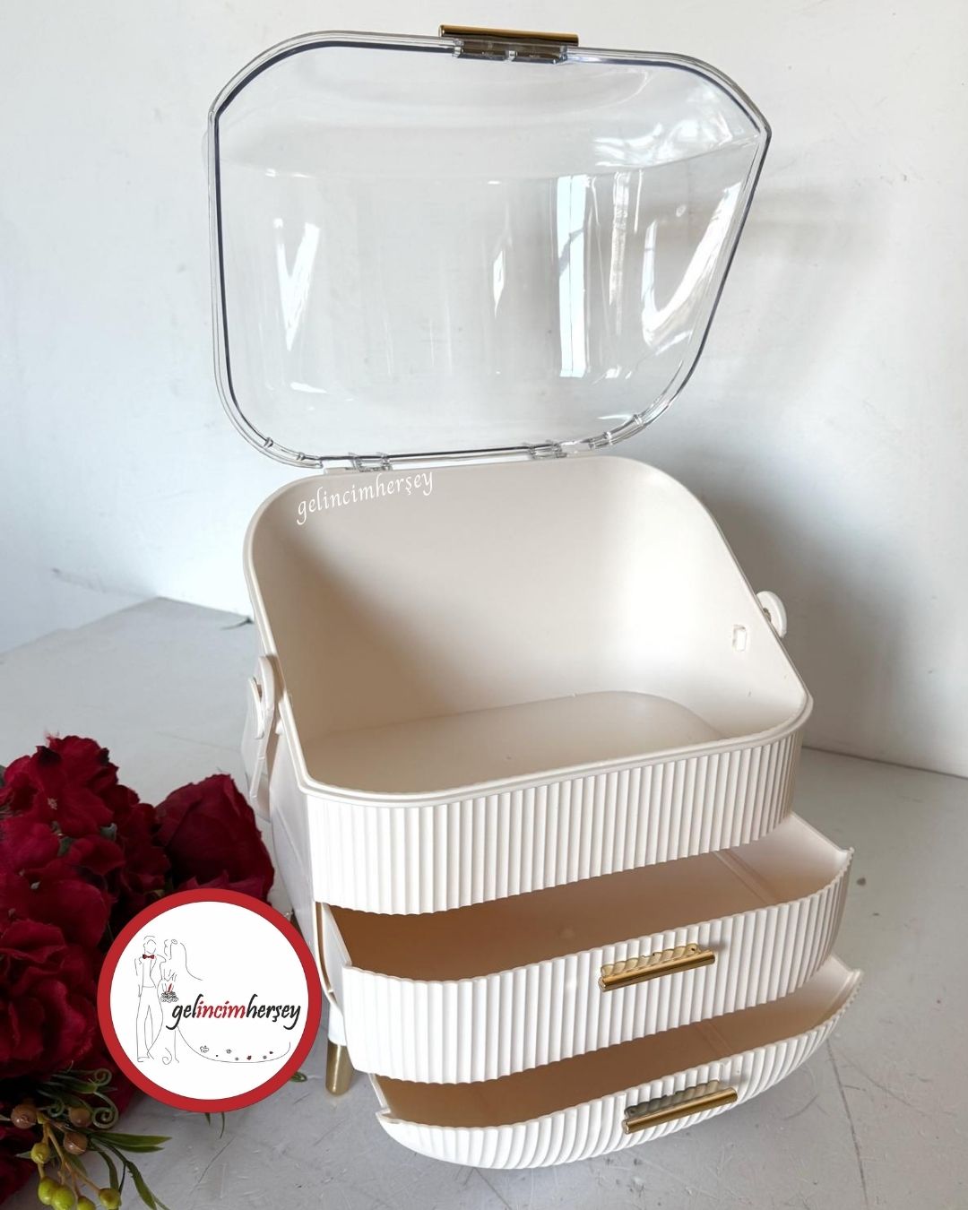 Gelincimherşey şeffaf kapaklı çekmeceli makyaj organizeri, gelin hazırlık sürecinde ve özel günlerde kullanılan makyaj malzemeleri ile küçük aksesuarları düzenli şekilde saklamak için tasarlanmıştır.
