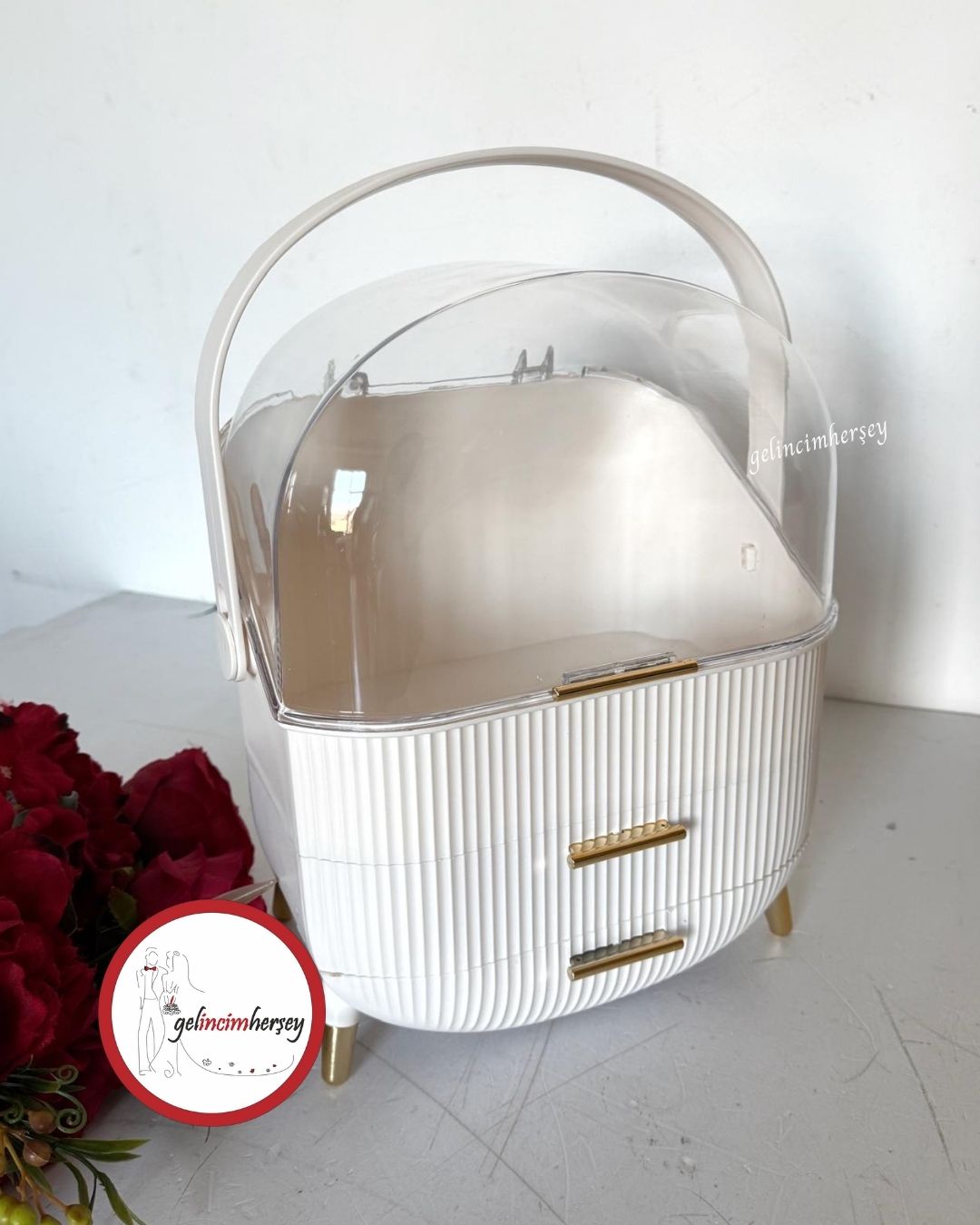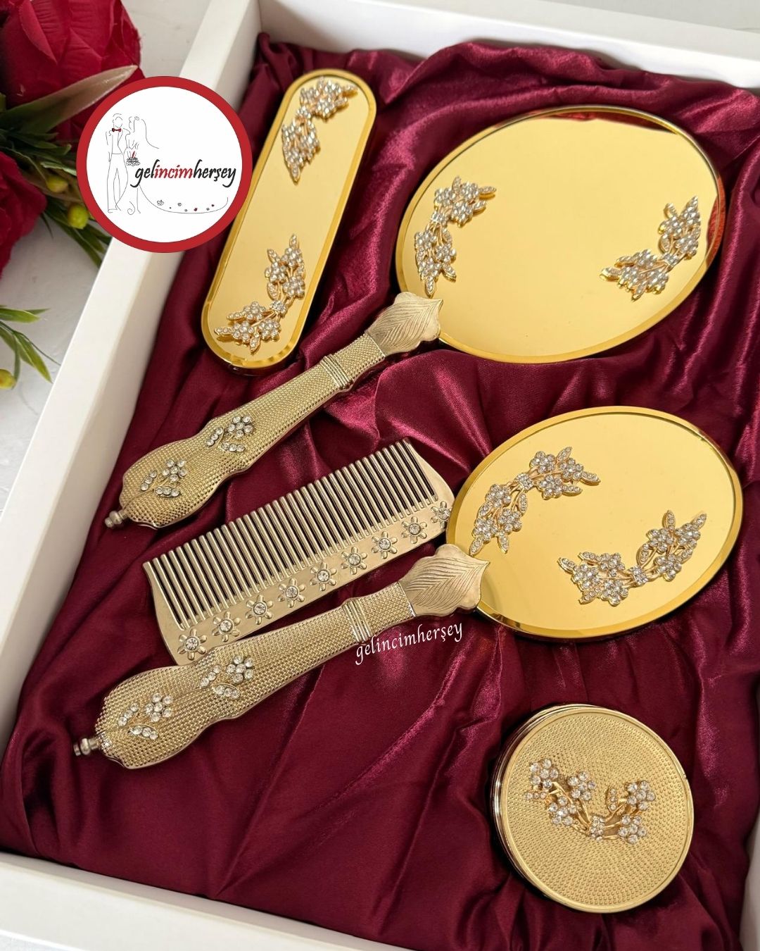 Gelincimherşey altın renk 5 parça ayna tarak seti, söz ve nişan bohçaları ile çeyiz hazırlıkları için özenle hazırlanmış şık bir hediyelik settir. Zarif tasarımıyla bohça sunumlarını tamamlar ve özel günlerinize estetik bir dokunuş katar.