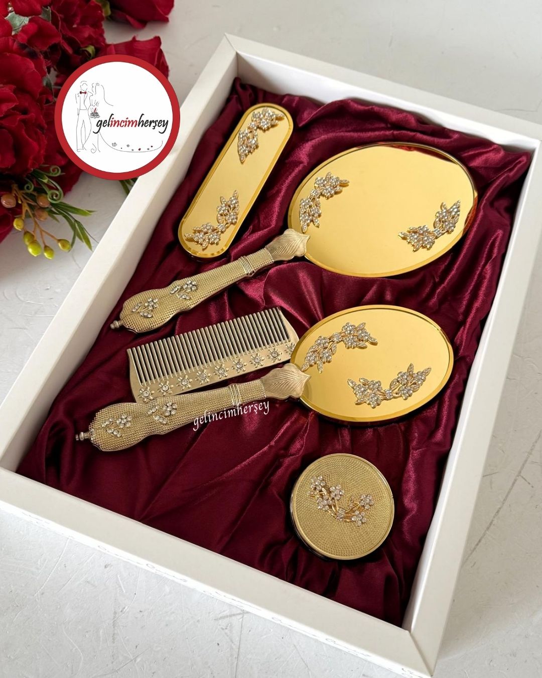 Gelincimherşey altın renk 5 parça ayna tarak seti, söz ve nişan bohçaları ile çeyiz hazırlıkları için özenle hazırlanmış şık bir hediyelik settir. Zarif tasarımıyla bohça sunumlarını tamamlar ve özel günlerinize estetik bir dokunuş katar.