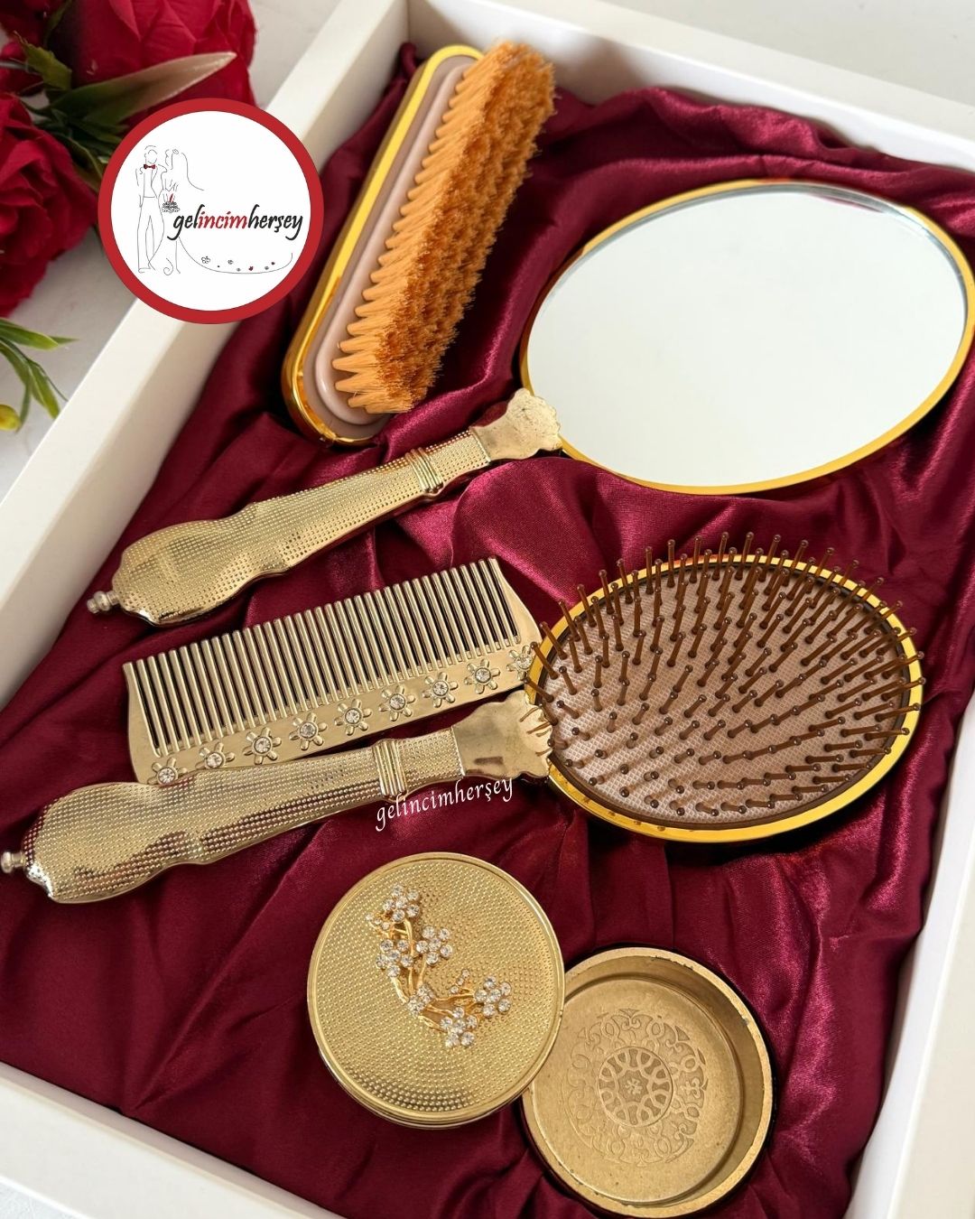 Gelincimherşey Söz Nişan Bohça için Hediyelik Çeyizlik Altın 5 Parça Ayna Tarak Seti
