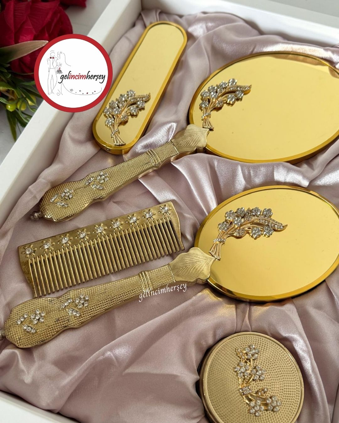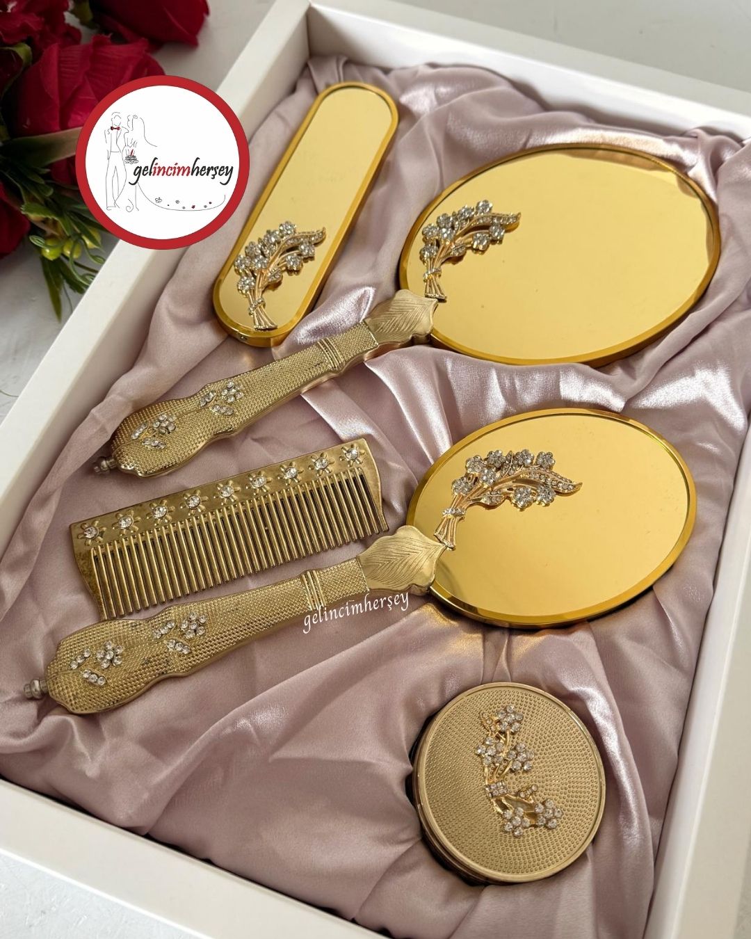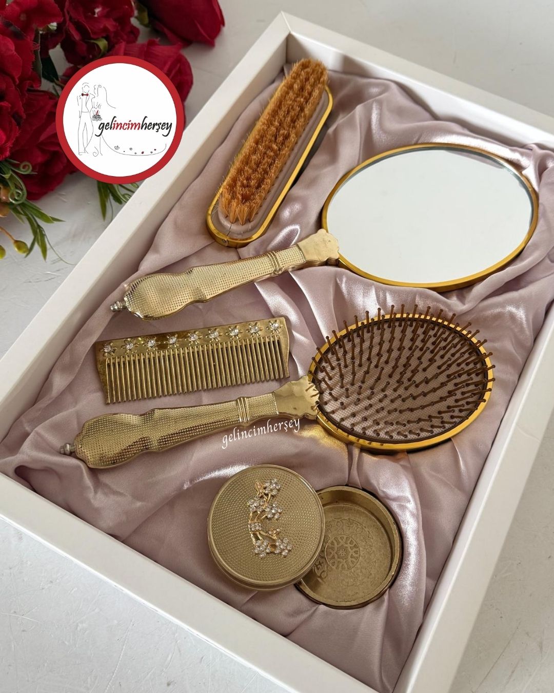 Gelincimherşey Söz Nişan Bohça için Hediyelik Çeyizlik Altın 5 Parça Ayna Tarak Seti